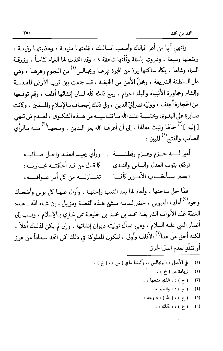 فلما حل ساحتها، وأعاد لها بعد التعب راحتها، وأزال عنها كل بوس وأضحك وجوه أملها العبوس، حضر لديه منشئ هذه القصة ومزيل - إن شاء الله - هذه الغصة عبد الأبواب الشريفة محمد بن محمد بن خليفة ممن غذي بالإسلام، ونسب الى أنصار النبي عليه السلام، وهي تسأل توليته ديوان إنشائها، وإن لم يكن لذلك أهلاً، لكنه أحق من هذا الأقلف وأولى، لتكون المملوكة في ذلك كمن اتخذ سداداً من عوز أو تقلّد لعدم الدرّ الخرز: