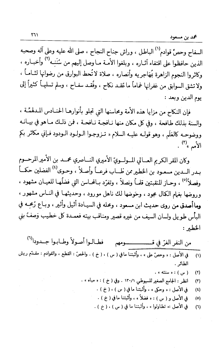 السفاح وحصّ قوادم الباطل، وراش جناح النجاح، صلى الله عليه وعلى آله وصحبه الذين حافظوا على اقتفاء آثاره، وبلغوا الأمة ما وصل إليهم من سُننه وأخباره، وكاثروا النجوم الزاهرة بمهاجريه وأنصاره، صلاة لا تُحط البوارق من رضوانها لثاماً، ولا تشق السوابق من غفرانها غماماً ما عُقد نكاح، وفُقد سفاح، وسلم تسليماً كثيراً الى يوم الدين وبعد: فإن النكاح من مزايا هذه الأمة ومحاسنها التي تجلو بأنوارها الحنادس المدلهمّة، والسنة بذلك طافحة، وفي كل مكان منها نافجة نافحة، فمن ذلك ما هو في بيانه ووضوحه كالعلم، وهو قوله عليه السلام " تزوجوا الولود الودود فإني مكاثر بكم الأمم ".