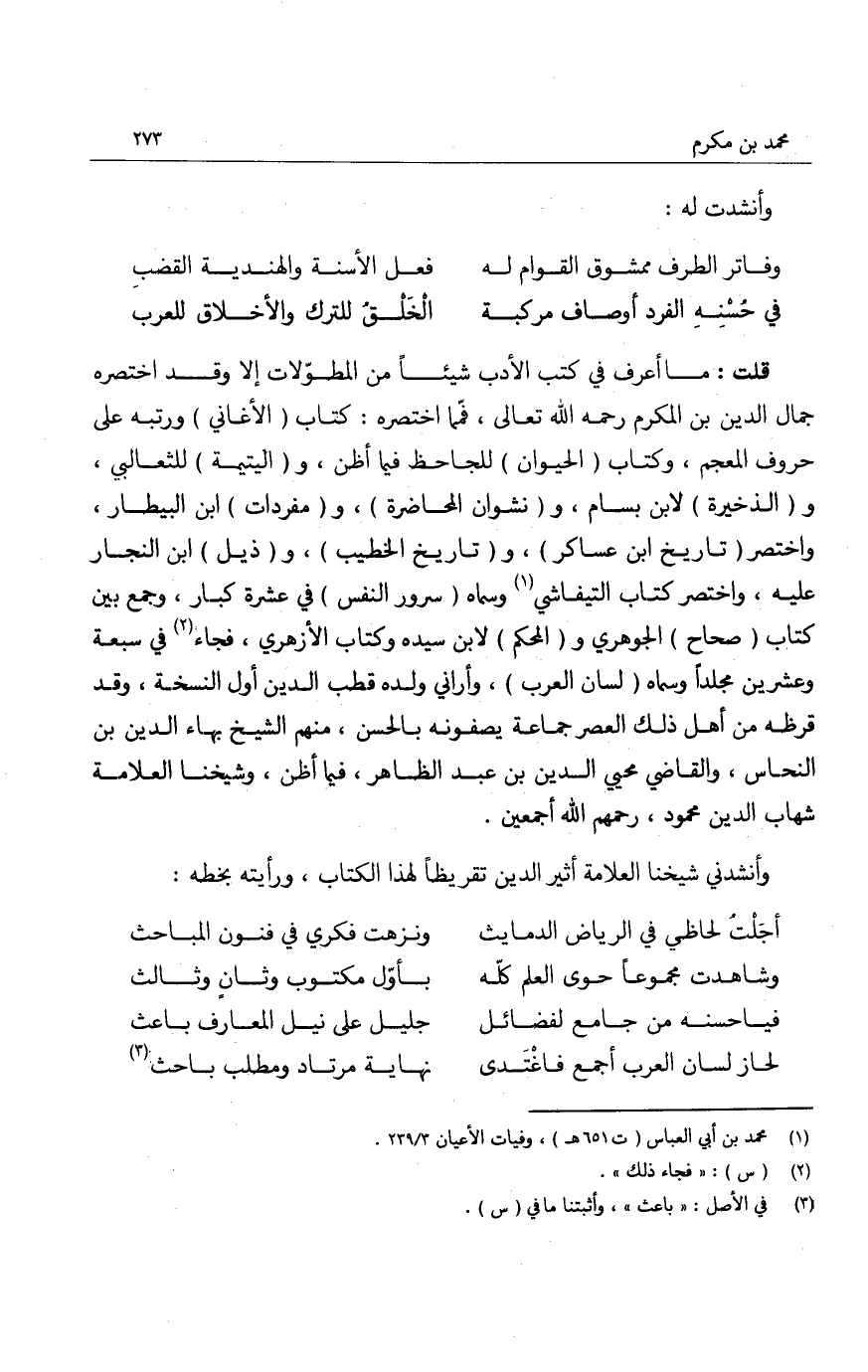 قلت: ما أعرف في كتب الأدب شيئاً من المطوّلات إلا وقد اختصره جمال الدين بن المكرم رحمه الله تعالى، فمما اختصره: كتاب الأغاني ورتبه على حروف المعجم، وكتاب الحيوان للجاحظ فيما أظن، واليتيمة للثعالبي، والذخيرة لابن بسام، ونشوان المحاضرة، ومفردات ابن البيطار، واختصر تاريخ ابن عساكر، وتاريخ الخطيب، وذيل ابن النجار عليه، واختصر كتاب التيفاشي وسماه سرور النفس في عشرة كبار، وجمع بين كتاب صحاح الجوهري والمحكم لابن سيده وكتاب الأزهري، فجاء في سبعة وعشرين مجلداً وسماه لسان العرب، وأراني ولده قطب الدين أول النسخة، وقد قرظه من أهل ذلك العصر جماعة يصفونه بالحسن، منهم الشيخ بهاء الدين بن النحاس، والقاضي محيي الدين بن عبد الظاهر، فيما أظن، وشيخنا العلامة شهاب الدين محمود، رحمهم الله أجمعين.