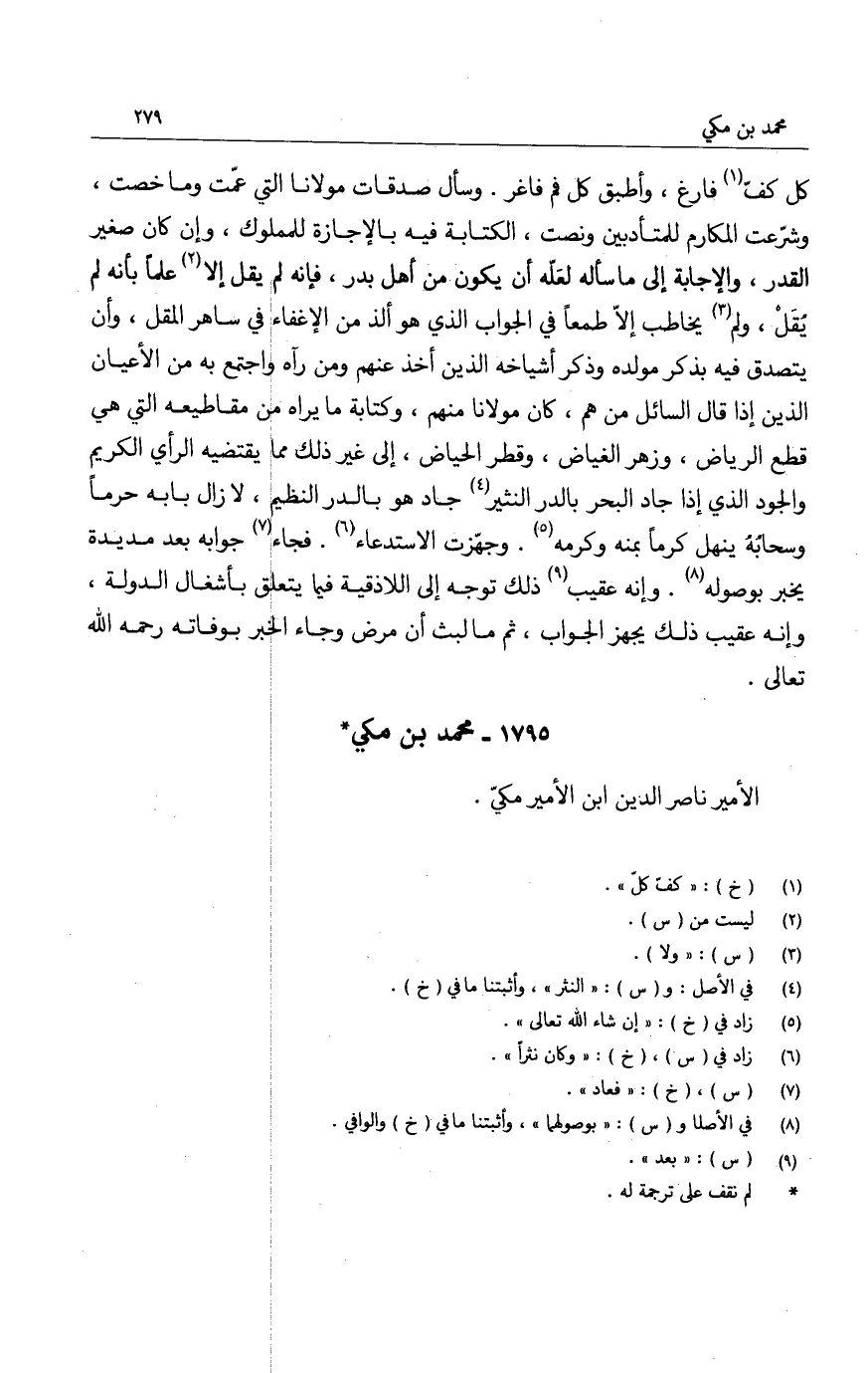 كل كفّ فارغ، وأطبق كل فم فاغر. وسأل صدقات مولانا التي عمّت وما خصت، وشرّعت المكارم للمتأدبين ونصت، الكتابة فيه بالإجازة للمملوك، وإن كان صغير القدر، والإجابة الى ما سأله لعله أن يكون من أهل بدر، فإنه لم يقل إلا علماً بأنه لم يُقَل، ولم يخاطب إلا طمعاً في الجواب الذي هو ألذ من الإغفاء في ساهر المقل، وأن يتصدق فيه بذكر مولده وذكر أشياخه الذين أخذ عنهم ومن رآه واجتمع به من الأعيان الذي إذا قال السائل من هم، كان مولانا منهم، وكتابة ما يراه من مقاطيعه التي هي قطع الرياض، وزهر الغياض، وقطر الحياض، الى غير ذلك مما يقتضيه الرأي الكريم والجود الذي إذا جاد البحر بالدر النثير جاد هو بالدر النظيم، لا زال بابه حرماً وسحابه ينهل كرماً بمنه وكرمه. وجهّزت الاستدعاء. فجاء جوابه بعد مديدة يخبر بوصوله. وإنه عقيب ذلك توجه الى اللاذقية فيما يتعلق بأشغال الدولة، وإنه عقيب ذلك يجهز الجواب، ثم ما لبث أن مرض وجاء الخبر بوفاته رحمه الله تعالى.