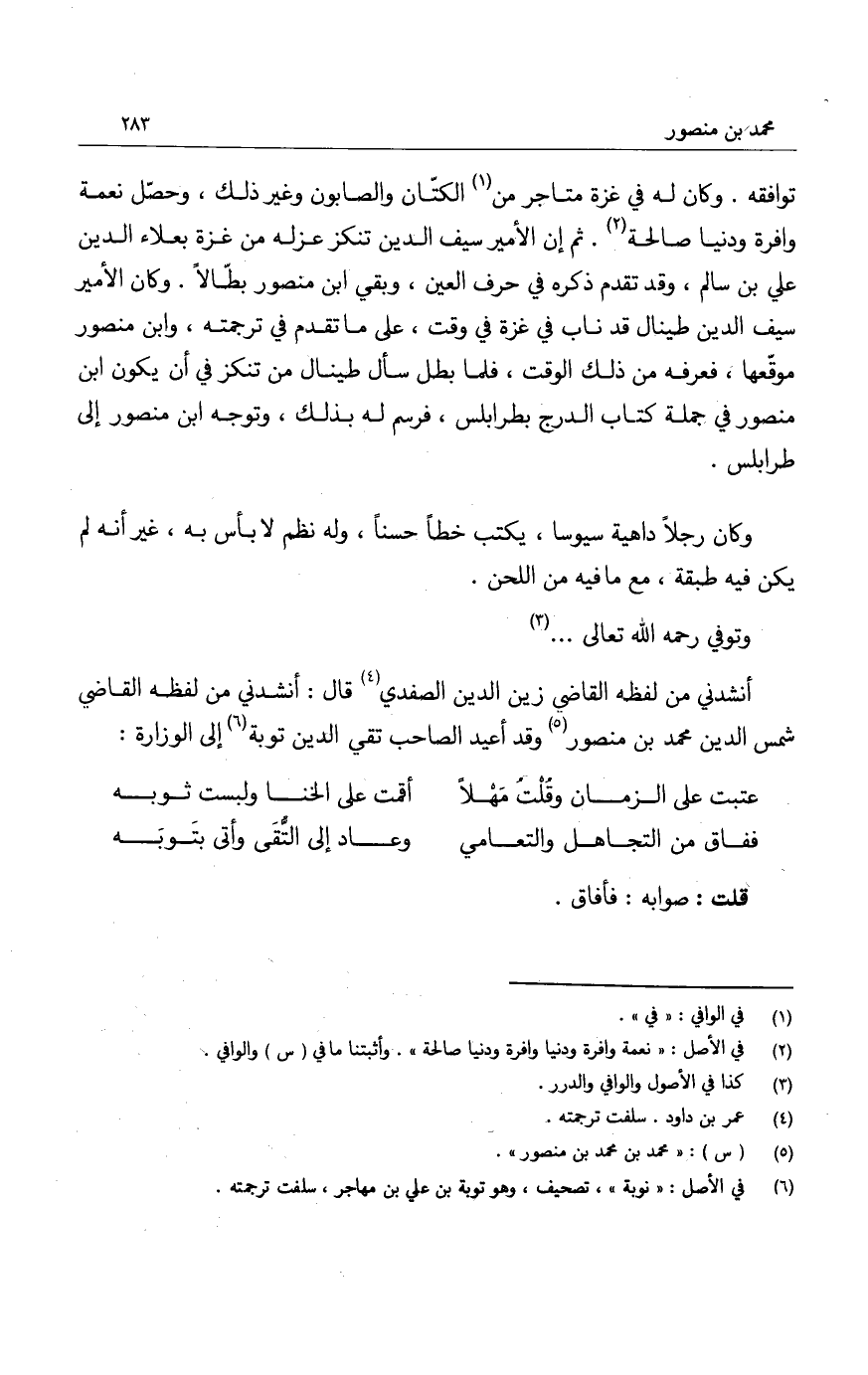 توافقه. وكان له في غزة متاجر من الكتّان والصابون وغير ذلك، وحصّل نعمة وافرة ودنيا صالحة. ثم إن الأمير سيف الدين تنكز عزله من غزة بعلاء الدين علي بن سالم، وقد تقدم ذكره في حرف العين، وبقي ابن منصور بطّالاً. وكان الأمير سيف الدين طينال قد ناب في غزة في وقت، على ما تقدم في ترجمته، وابن منصور موقّعها، فعرفه من ذلك الوقت، فلما بطل سأل طينال من تنكز في أن يكون ابن منصور في جملة كتاب الدرج بطرابلس، فرسم له بذلك، وتوجه ابن منصور الى طرابلس.