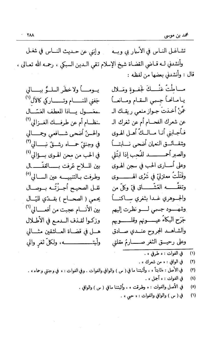 وأنشدني له قاضي القضاة شيخ الإسلام تقي الدين السبكي، رحمه الله تعالى، قال: وأنشدني بعضها من لفظه: