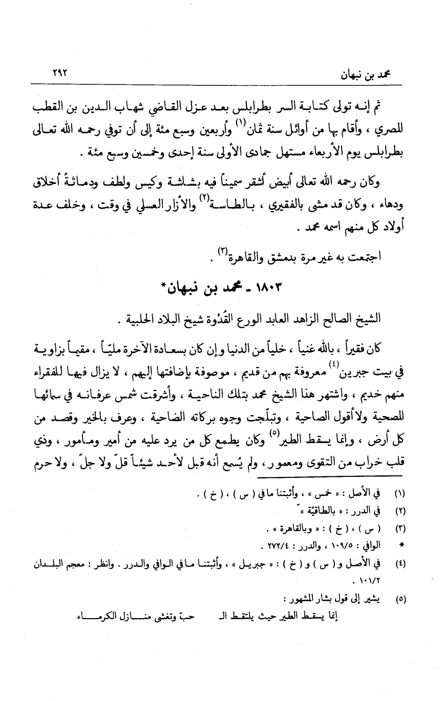 الشيخ الصالح الزاهد العابد الورع القدوة شيخ البلاد الحلبية.