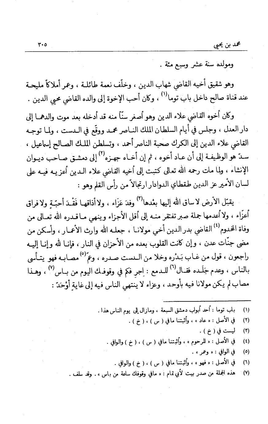 يقبّل الأرض لا ساق الله إليها بعدها وفدَ عزاء، ولا أذاقها فَقْدَ أحبّةٍ ولا فراق أعزاء، ولا أعدمها جملة صبر تفتقر منه الى أقل الأجزاء وينهي ما قدره الله تعالى من وفاة المخدوم القاضي بدر الدين أخي مولانا، جعله الله وارث الأعمار، وأسكن من مضى جنّات عدن، وإن كانت القلوب بعده من الأحزان في النار، فإنا لله وإنا إليه راجعون، قول من غاب بدره وخلا من الدست صدره، وعمّ مصابه فهو يتأسى بالناس، وعدم جَلَده فقال للدمع: اجرِ فكم في وقوفك اليوم من باس، وهذا مصاب لم يكن مولانا فيه بأوحد، وعزاء لا ينتهي الناس فيه الى غايةٍ أو حدّ: