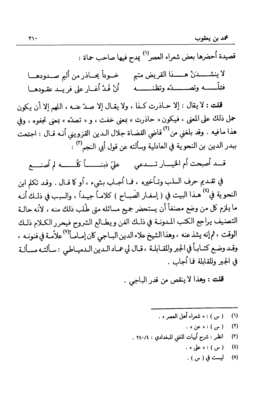 في تقديم حرف السلب وتأخيره، فما أجاب بشيء، أو كما قال. وقد تكلم ابن النحوية في هذا البيت في إسفار الصباح كلاماً جيداً، والسبب في ذلك أنه ما يلزم كل من وضع مصنفاً أن يستحضر جميع مسائله متى طُلب ذلك منه، لأنه حالة التصنيف يراجع الكتب المدونة في ذلك الفن ويطالع الشروح فيحرر الكلام ذلك الوقت، ثم إنه يشذ عنه، وهذا الشيخ علاء الدين الباجي كان إماماً علامة في فنونه، وقد وضع كتاباً في الجبر والمقابلة، قال لي عماد الدين الدمياطي: سألته مسألة في الجبر والمقابلة فما أجاب.