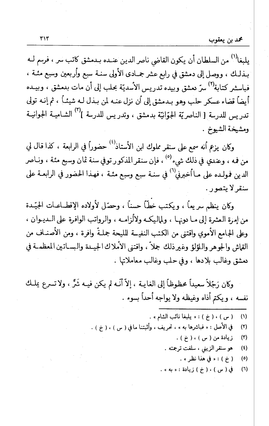 يلبغا من السلطان أن يكون القاضي ناصر الدين عنده بدمشق كاتب سر، فرسم له بذلك، ووصل الى دمشق في رابع عشر جمادى الأولى سنة سبع وأربعين وسبع مئة، فباشر كتابة سرّ دمشق وبيده تدريس الأسدية بحلب الى أن مات بدمشق، وبيده أيضاً قضاء عسكر حلب وهو بدمشق الى أن نزل عنه لمن بذل له شيئاً، ثم إنه تولى تدريس المدرسة الناصرية الجوّانية بدمشق، وتدريس المدرسة الشامية الجوانية ومشيخة الشيوخ.