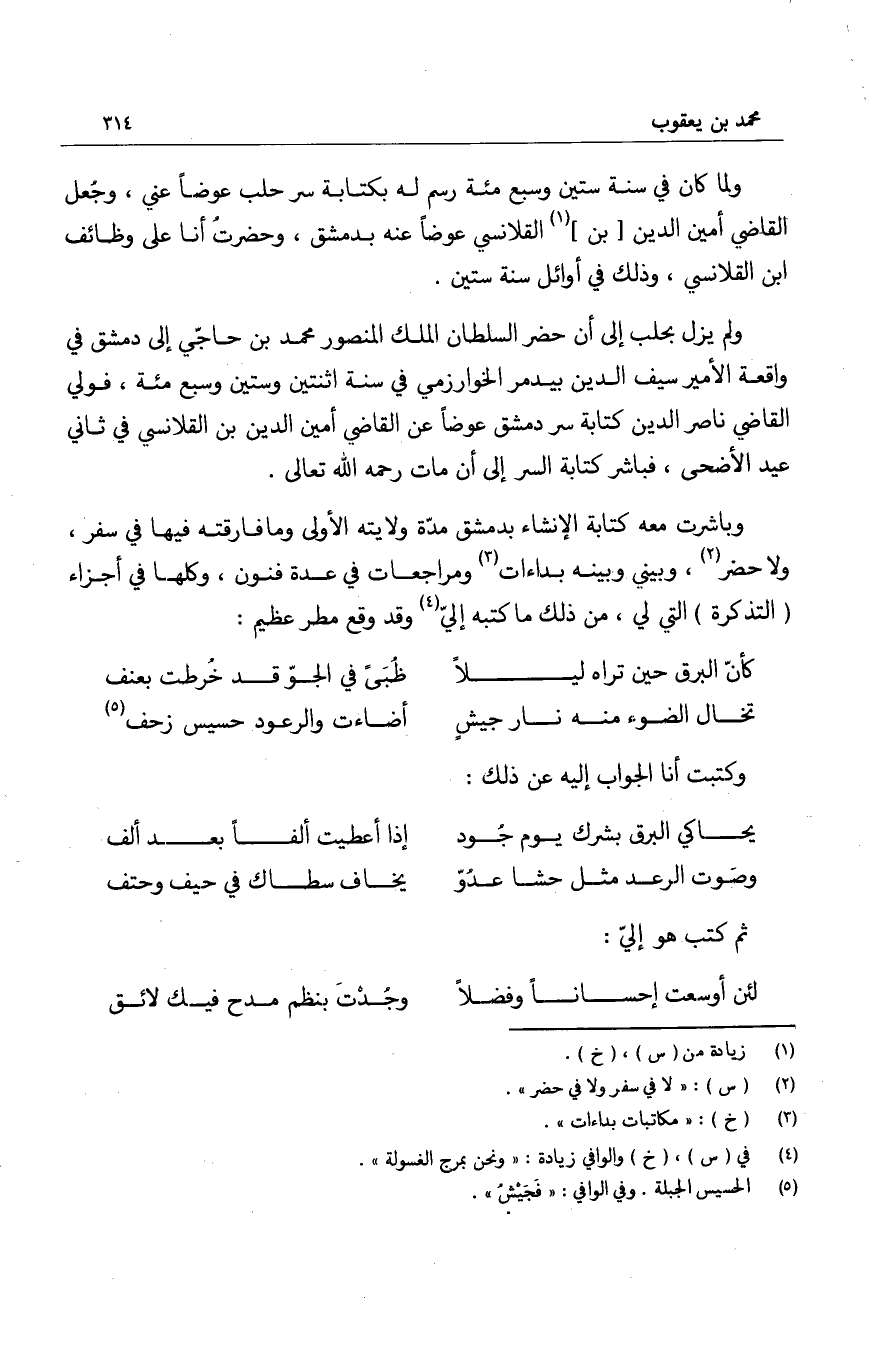 وباشرت معه كتابة الإنشاء بدمشق مدة ولايته الأولى وما فارقته فيها في سفر، ولا حضر، وبيني وبينه بداءات ومراجعات في عدة فنون، وكلها في أجزاء التذكرة التي لي، من ذلك ما كتبه إليّ وقد وقع مطر عظيم: