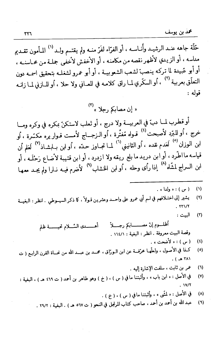 حُلّة جاهه عند الرشيد وأناسه، أو الفرّاء لفرّ منه ولم يقتسم ولد المأمون تقديم مداسه، أو الزيدي لأظهر نقصه من مكامنه، أو الأخفض لأخفى جملة من محاسنه، أو أبو عبيدة لما تركه ينصبّ لشعب الشعوبية، أو أبو عمرو لشغله بتحقيق اسمه دون التعلّق بعربية، أو السكّري لما راق كلامه في المعاني ولا حلا، أو المازني لما زانه قوله: