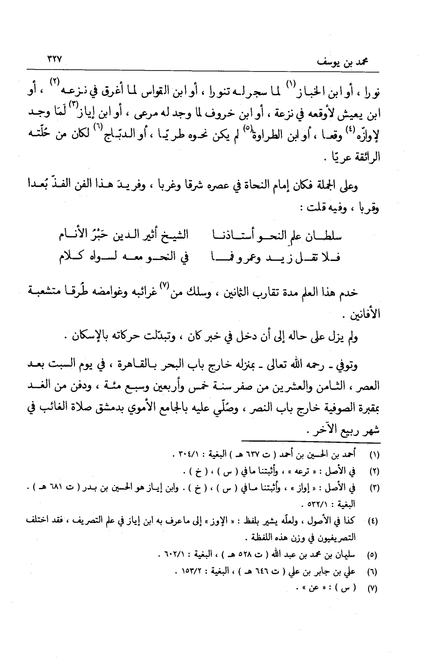 نورا، أو ابن الخباز لما سجر له تنورا، أو ابن القواس لما أغرق في نزعه، أو ابن يعيش لأوقعه في نزعة، أو ابن خروف لما وجد له مرعى، أو ابن إياز لما وجد لإوازّه وقعا، أو ابن الطراوة لم يكن نحوه طريّا، أو الدبّاج لكان من حلّته الرائقة عريّا.