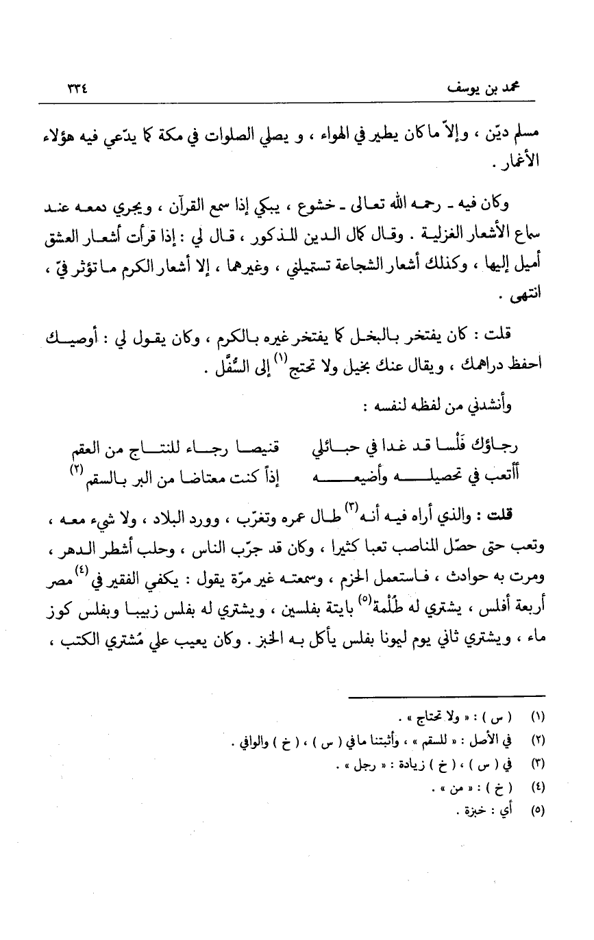 وكان فيه - رحمه الله تعالى - خشوع، يبكي إذا سمع القرآن، ويجري دمعه عند سماع الأشعار الغزلية. وقال كمال الدين المذكور، قال لي: إذا قرأت أشعار العشق أميل إليها، وكذلك أشعار الشجاعة تستميلني، وغيرهما، إلا أشعار الكرم ما تؤثر فيّ، انتهى.
