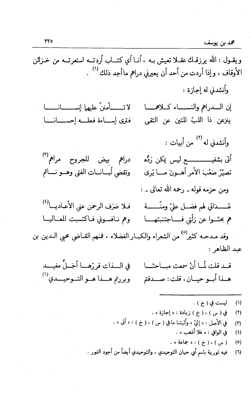 ويقول: الله يرزقك عقلاً تعيش به، أنا أي كتاب أردته استعرته من خزائن الأوقاف، وإذا أردت من أحد أن يعيرني دراهم ما أجد ذلك.