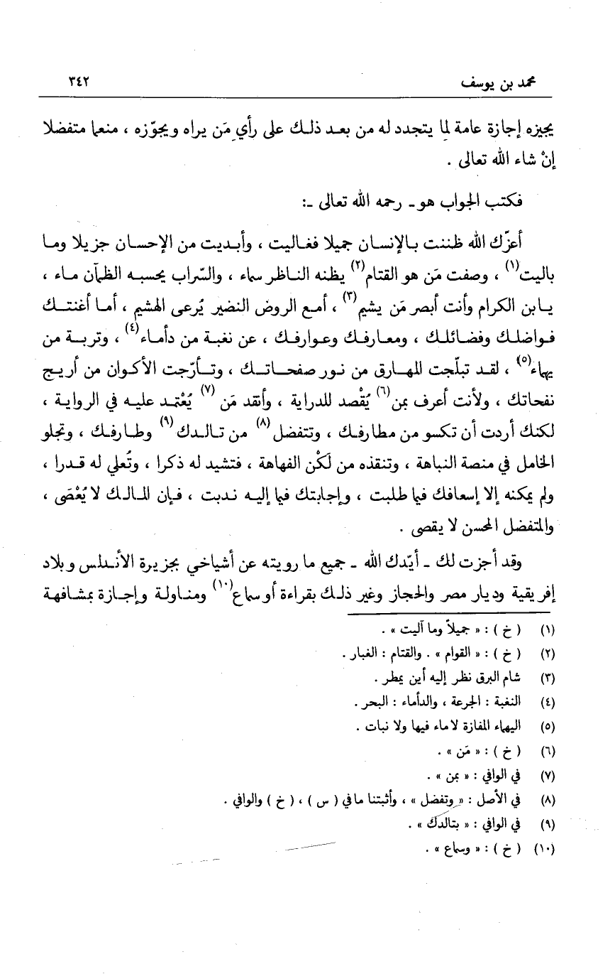 وقد أجزت لك - أيّدك الله - جميع ما رويته عن أشياخي بجزيرة الأندلس وبلاد إفريقية وديار مصر والحجاز وغير ذلك بقراءة أو سماع ومناولة وإجازة بمشافهة