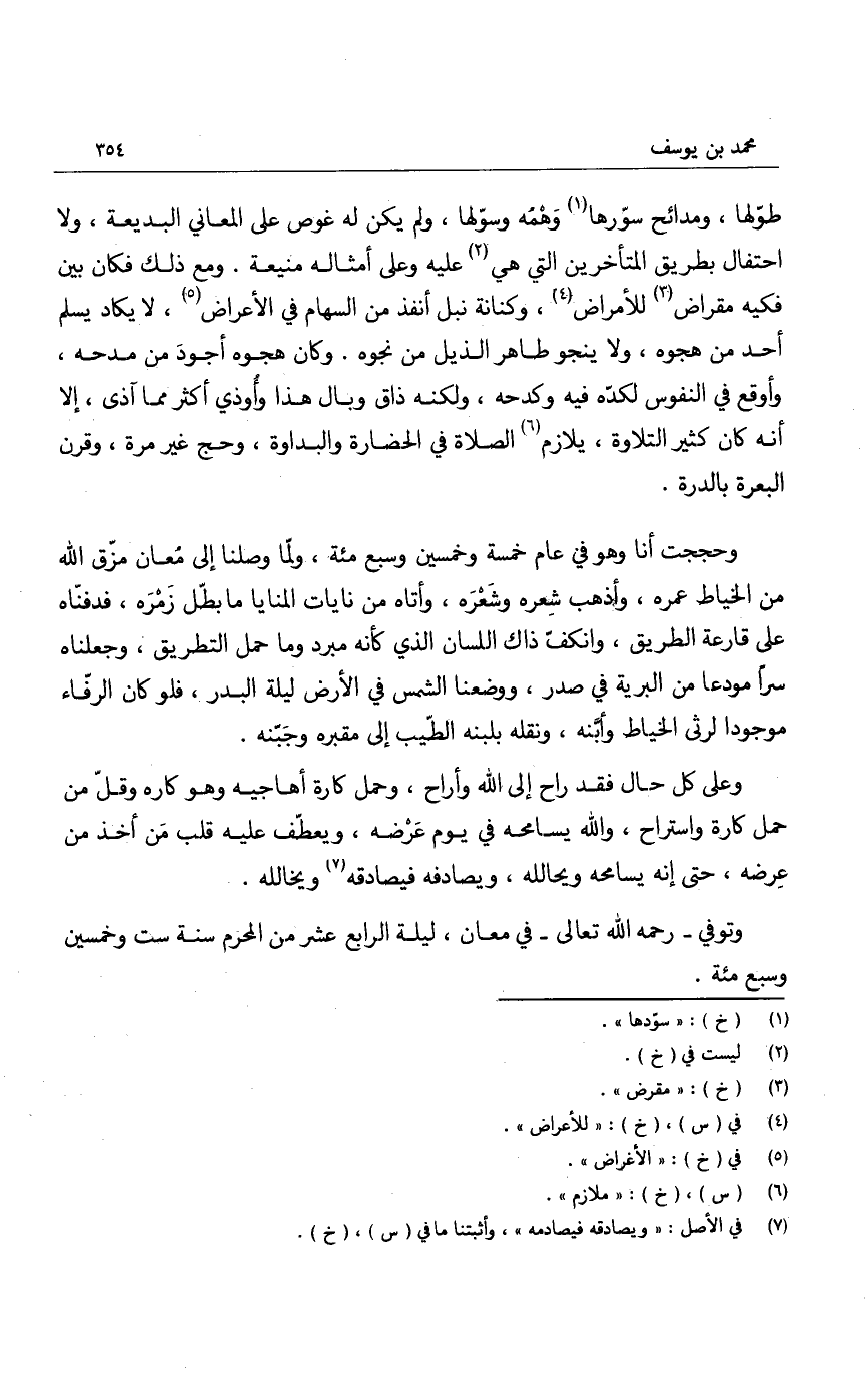 وحججت أنا وهو في عام خمسة وخمسين وسبع مئة، ولما وصلنا الى مُعان مزّق الله من الخياط عمره، وأذهب شعره وشعره، وأتاه من نايات المنايا ما بطّل زمرَه، فدفنّاه على قارعة الطريق، وانكفّ ذاك اللسان الذي كأنه مبرد وما حمل التطريق، وجعلناه سراً مودعاً من البرية في صدر، ووضعنا الشمس في الأرض ليلة البدر، فلو كان الرفّاء موجوداً لرثى الخياط وأبّنه، ونقله بلبنه الطيب الى مقبره وجبّنه.