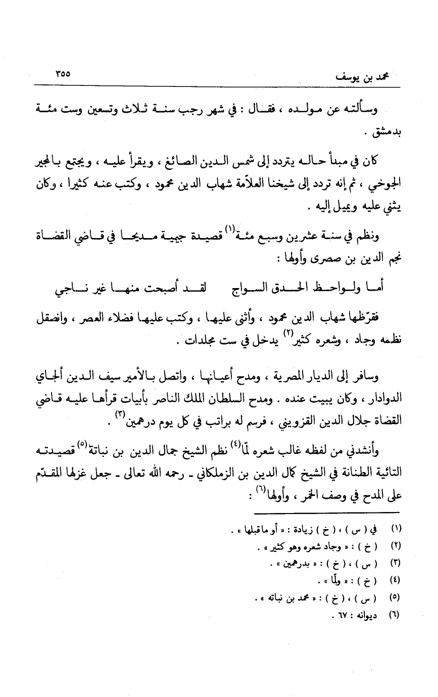 وأنشدني من لفظه غالب شعره لما نظم الشيخ جمال الدين بن نباتة قصيدته التائية الطنانة في الشيخ كمال الدين بن الزملكاني - رحمه الله تعالى - جعل غزلها المقدّم على المدح في وصف الخمر، وأولها: