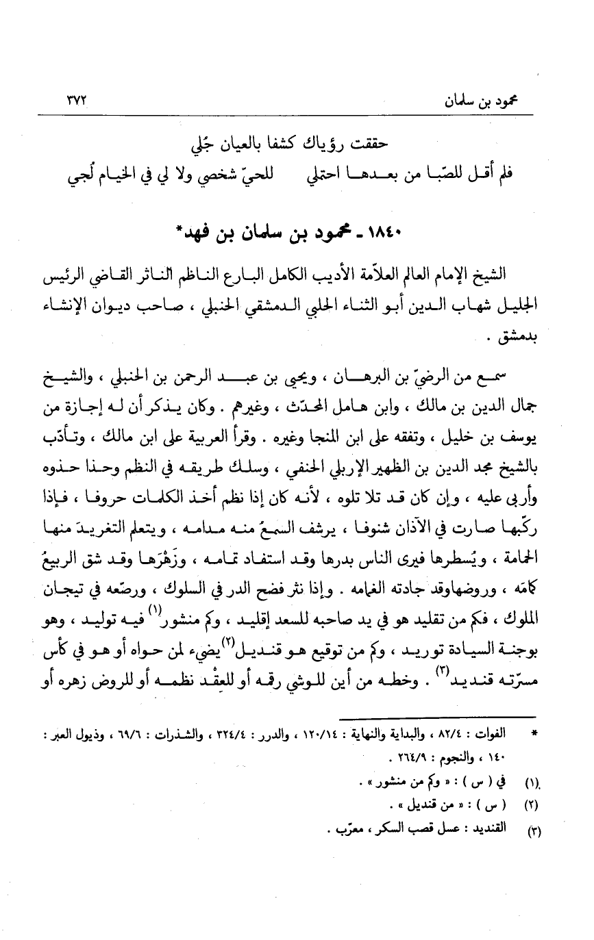 الشيخ الإمام العالم العلامة الأديب الكامل البارع الناظم الناثر القاضي الرئيس الجليل شهاب الدين أبو الثناء الحلبي الدمشقي الحنبلي، صاحب ديوان الإنشاء بدمشق.