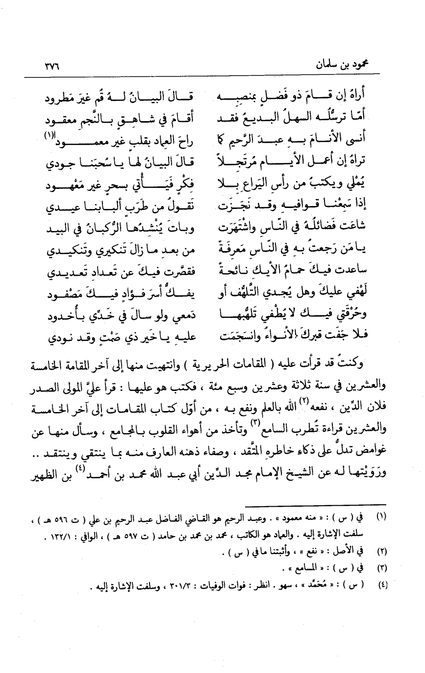 وكنتُ قد قرأت عليه المقامات الحريرية وانتهيت منها الى آخر المقامة الخامسة والعشرين في سنة ثلاثة وعشرين وسبع مئة، فكتب هو عليها: قرأ عليّ المولى الصدر فلان الدّين، نفعه الله بالعلم ونفع به، من أوّل كتاب المقامات الى آخر الخامسة والعشرين قراءة تُطرب السامع وتأخذ من أهواء القلوب بالمجامع، وسأل منها عن غوامض تدلّ على ذكاء خاطره المتّقد، وصفاء ذهنه العارف منه بما ينتفي وينتقد. ورويتها له عن الشيخ الإمام مجد الدين أبي عبد الله محمد بن أحمد بن الظهير
