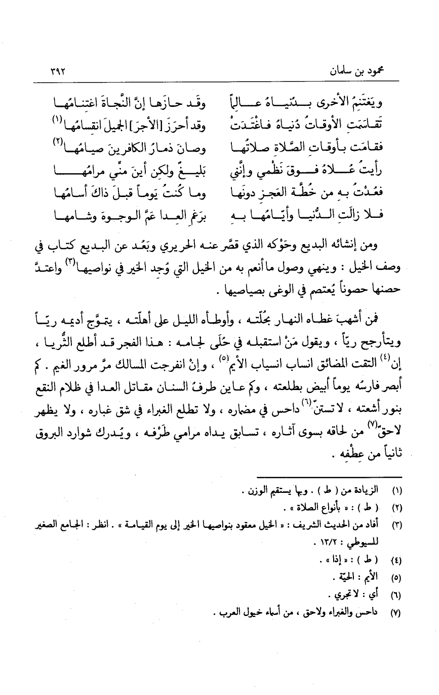 ومن إنشائه البديع وحوكه الذي قصّر عنه الحريري وبعُد عن البديع كتاب في وصف الخيل: وينهي وصول ما أنعم به من الخيل التي وجد الخير في نواصيها واعتدّ حصنها حصوناً يعتصم في الوغى بصياصيها.