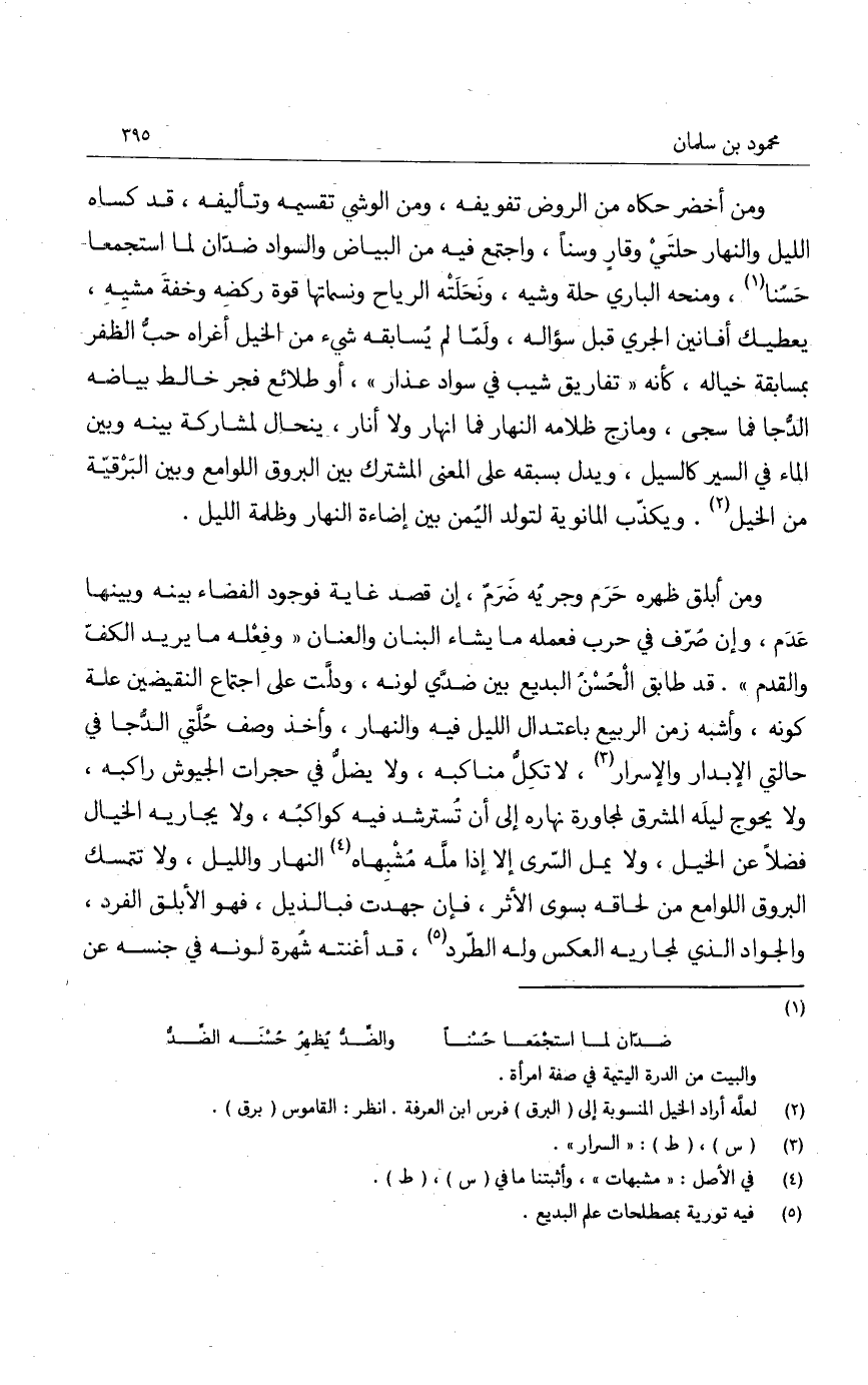 ومن أخضر حكاه من الروض تفويفه، ومن الوشي تقسيمه وتأليفه، قد كساه الليل والنهار حلتَيْ وقار وسناً، واجتمع فيه من البياض والسواد ضدّان لما استُجمعا حَسُنا، ومنحه الباري حلة وشيه، ونحلَتْه الرياح ونسماتها قوة ركضه وخفةَ مشيه، يعطيك أفانين الجري قبل سؤاله، ولما لم يُسابقه شيء من الخيل أغراه حبُّ الظفر بمسابقة خياله، كأنه تفاريق شيب في سواد عذار، أو طلائع فجر خالط بياضه الدُجا فما سجى، ومازج ظلامه النهار فما انهار ولا أنار، ينحال لمشاركة بينه وبين الماء في السير كالسيل، ويدل بسبقه على المعنى المشترك بين البروق اللوامع وبين البرقية من الخيل. ويكذّب المانوية لتولد اليُمن بين إضاءة النهار وظلمة الليل.