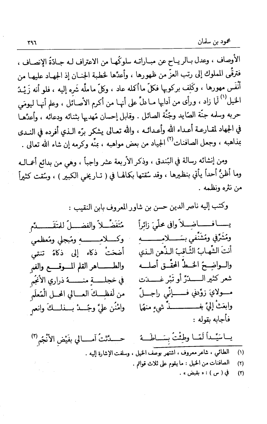 الأوصاف، وعدل بالرياح عن مباراته سلوكُها من الاعتراف له جادةُ الإنصاف، فترقّى المملوك الى رتب العزّ من ظهورها، وأعدّها لخطبة الجنان إذ الجهاد عليها من أنفَس مهورها، وكلِف بركوبها فكل ما أكمله عاد، وكل ما ملّه شرِه إليه، فلو أنه زَيدُ الخيل لما زاد، ورأى من آدابها ما دلّ على أنها من أكرم الأصائل، وعلم أنها ليوميَ حربه وسلمه جنة الصّايد وجُنّة الصائل. وقابل إحسان مُهديها بثنائه ودعائه، وأعدّها في الجهاد لمقارعة أعداء الله وأعدائه، والله تعالى يشكر برّه الذي أفرده في الندى بمذاهبه، وجعل الصافنات الجياد من بعض مواهبه، بمنّه وكرمه إن شاء الله تعالى.