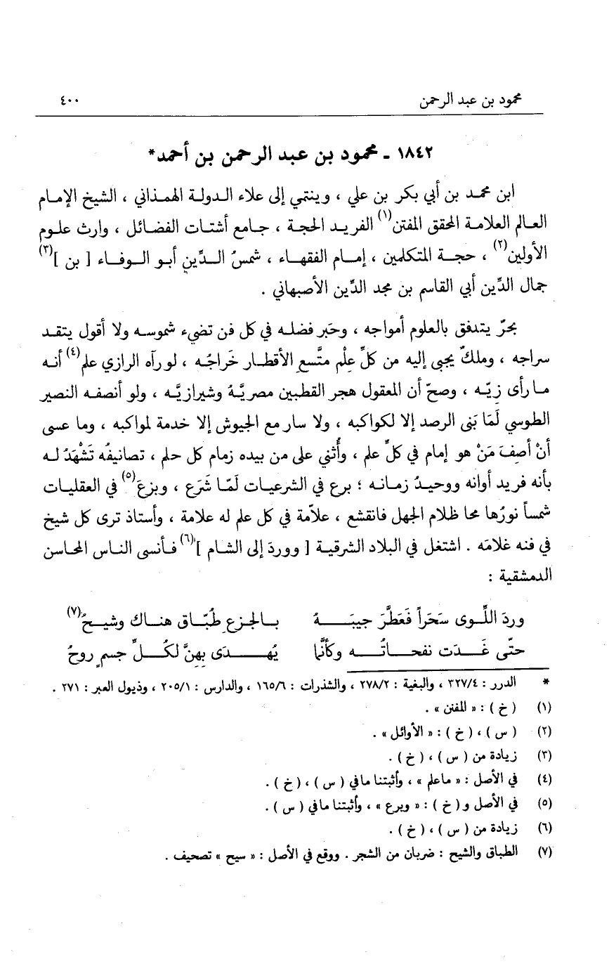 بحرٌ يتدفق بالعلوم أمواجه، وحبر فضله في كل فن تضيء شموسه ولا أقول يتقد سراجه، وملكٌ يجبى إليه من كل علم متّسعِ الأقطار خَراجُه، لو رآه الرازي علم أنه ما رأى زيّه، وصحّ أن المعقول هجر القطبين مصريّهُ وشيرازيّه، ولو أنصفه النصير الطوسي لما بني الرصد إلا لكواكبه، ولا سار مع الجيوش إلا خدمة لمواكبه، وما عسى أن أصفَ مَن هو إمام في كل علم، وأُثني على من بيده زمام كل حلم، تصانيفه تشهد له بأنه فريد أوانه ووحيد زمانه، برع في الشرعيات لما شرع، وبزع في العقليات شمساً نورها محا ظلام الجهل فانقشع، علامة في كل علم له علامة، وأستاذ ترى كل شيخ في فنه غلامه. اشتغل في البلاد الشرقية وورد الى الشام فأنسى الناس المحاسن الدمشقية: