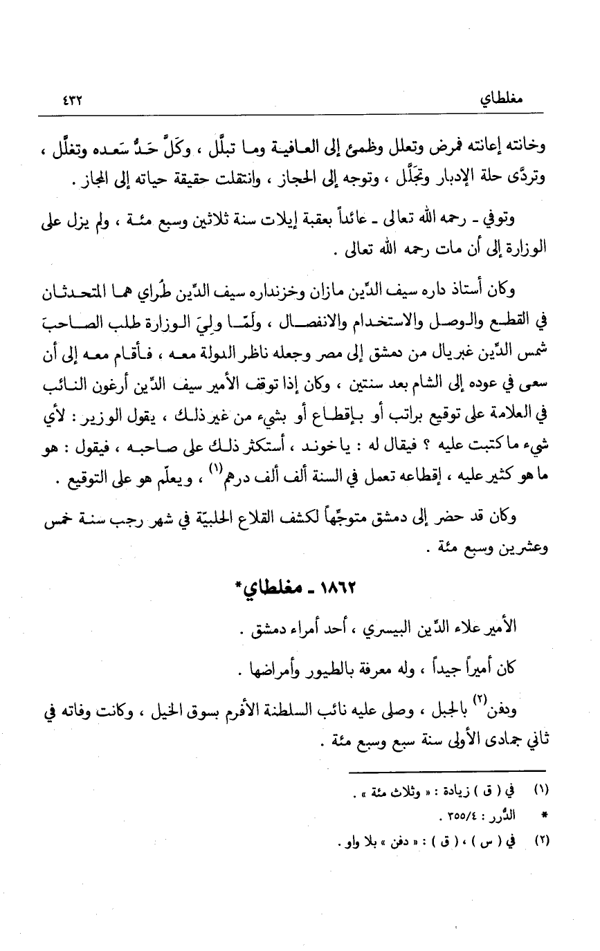 وكان قد حضر الى دمشق متوجهاً لكشف القلاع الحلبية في شهر رجب سنة خمس وعشرين وسبع مئة.