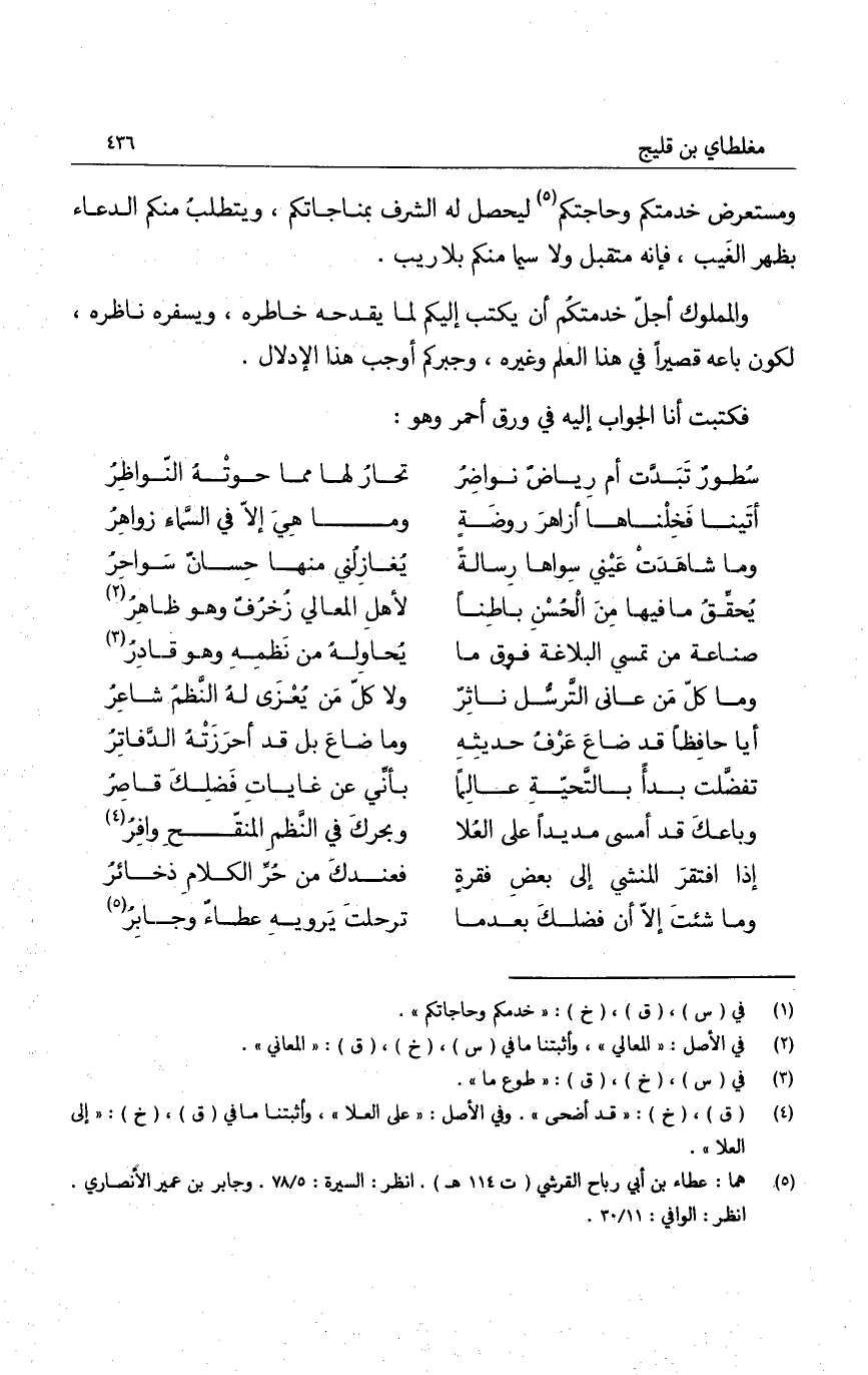 والمملوك أجلّ خدمتكم أن يكتب إليكم لما يقدحه خاطره، ويسفره ناظره، لكون باعه قصيراً في هذا العلم وغيره، وجبركم أوجب هذا الإدلال.