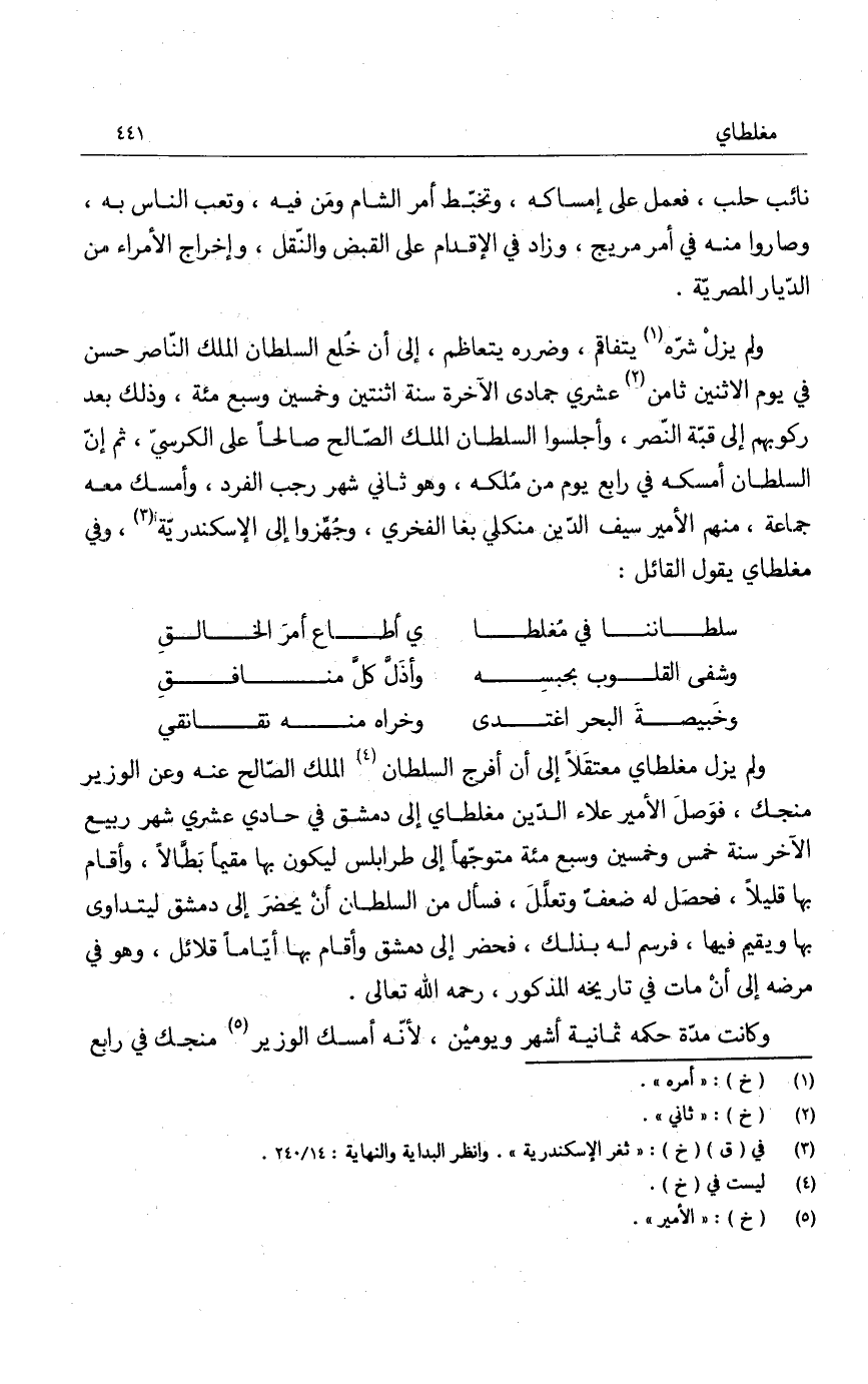 ولم يزل مغلطاي معتَقلاً الى أن أفرج السلطان الملك الصالح عنه وعن الوزير منجك، فوصل الأمير علاء الدين مغلطاي الى دمشق في حادي عشري شهر ربيع الآخر سنة خمس وخمسين وسبع مئة متوجهاً الى طرابلس ليكون بها مقيماً بطّالاً، وأقام بها قليلاً، فحصل له ضعفٌ وتعلّل، فسأل من السلطان أن يحضر الى دمشق ليتداوى بها ويقيم يها، فرسم له بذلك، فحضر الى دمشق وأقام بها أياماً قلائل، وهو في مرضه الى أن مات في تاريخه المذكور، رحمه الله تعالى.