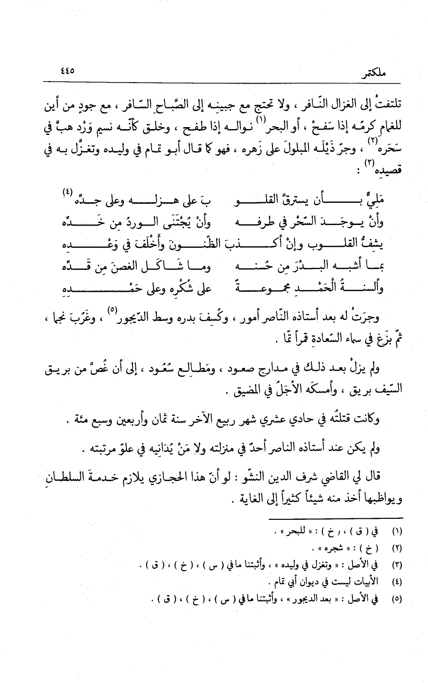 ولم يزل بعد ذلك في مدارج صعود، ومطالع سعود، الى أن غُصّ من بريق السيف بريق، وأمسكه الأجَل في المشيق.