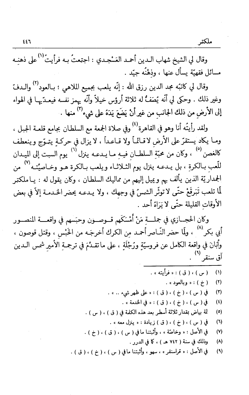 ولقد رأيته وهو في القاهرة وفي صلاة الجمعة مع السلطان بجامع قلعة الجبل، وما يكاد يستقرّ على الأرض لا قائماً ولا قاعداً، لا يزال في حركة يتموج وينعطف كالغصن، وكان من محبة السلطان فيه ما يدعه ينزل يوم السبت الى الميدان للعب بالكرة، بل يدعه ينزل يوم الثلاثاء ويلعب بالكرة هو وخاصيّته من الجمداريّة الذين يألف بهم ويميل إليهم من مماليك السلطان، وكان يقول له: يا