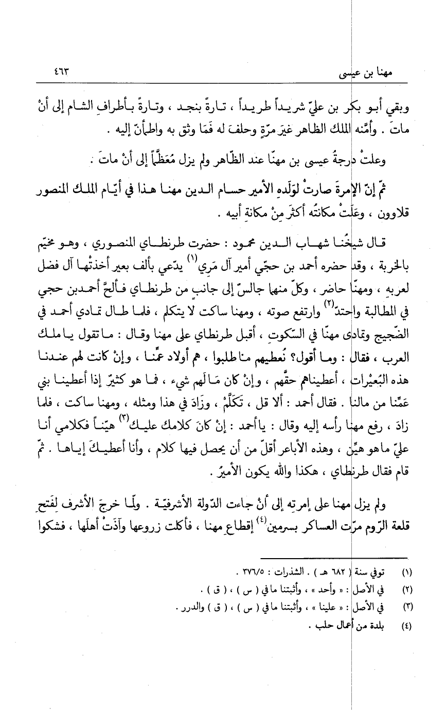 ثم إن الإمرة صارت لولده الأمير حسام الدين مهنا هذا في أيام الملك المنصور قلاوون، وعلت مكانته أكثر من مكانة أبيه.