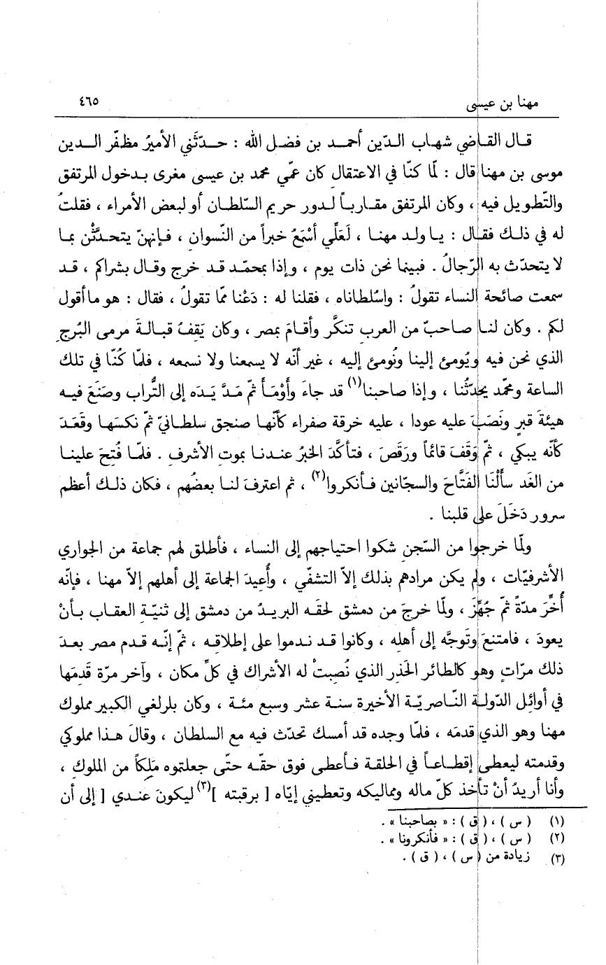 قال القاضي شهاب الدين أحمد بن فضل الله: حدّثني الأمير مظفّر الدين موسى بن مهنا قال: لما كنا في الاعتقال كان عمي محمد بن عيسى مغرى بدخول المرتفق والتطويل فيه، وكان المرتفق مقارباً لدور حريم السلطان أو لبعض الأمراء، فقلت له في ذلك فقال: يا ولد مهنا، لعلي أسمع خبراً من النسوان، فإنهن يتحدّثن بما لا يتحدث به الرجال. فبينما نحن ذات يوم، وإنما بمحمد قد خرج وقال بشراكم، قد سمعت صائحة النساء تقول: واسلطاناه، فقلنا له: دعنا مما تقول، فقال: هو ما أقول لكم. وكان لنا صاحب من العرب تنكّر وأقام بمصر، وكان يقف قبالة مرمى البُرج الذي نحن فيه ويومئ إلينا ونومئ إليه، غير أنه لا يسمعنا ولا نسمعه، فلما كنا في تلك الساعة ومحمد يحدثنا، وإذا بصاحبنا قد جاء وأومأ ثم مدّ يده الى التراب وصنع فيه هيئة قبر ونصب عليه عوداً، عليه خرقة صفراء كأنها صنجق سلطاني ثم نكسها وقعد كأنه يبكي، ثم وقف قائماً ورقص، فتأكّد الخبر عندنا بموت الأشرف. فلما فُتح علينا من الغد سألنا الفتّاح والسجانين فأنكروا، ثم اعترف لنا بعضهم، فكان ذلك أعظم سرور دخل على قلبنا.
