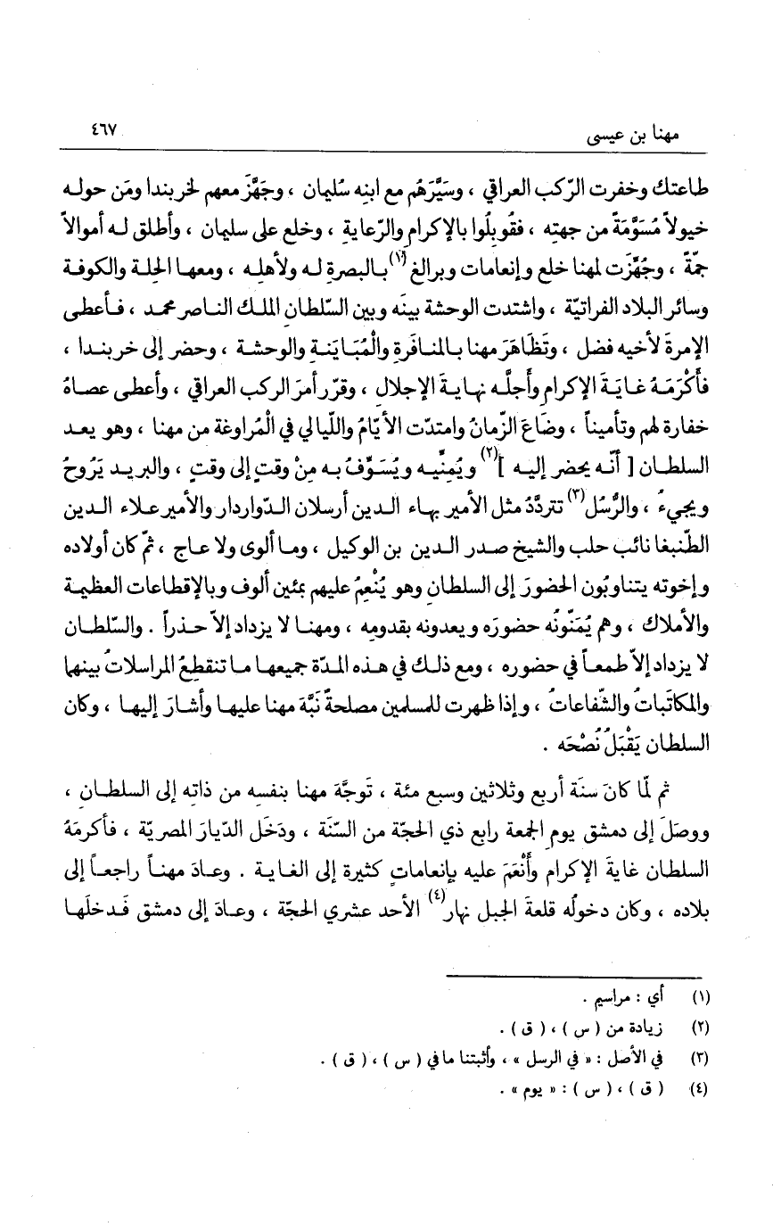 طاعتك وخفرت الرّكب العراقي، وسيّرهم مع ابنه سليمان، وجهّز معهم لخربندا ومن حوله خيولاً مسوّمة من جهته، فقوبلوا بالإكرام والرعاية، وخلع على سليمان، وأطلق له أموالاً جمة، وجهّزت لمهنا خلع وإنعامات وبرالغ بالبصرة له ولأهله، ومعها الحلة والكوفة وسائر البلاد الفراتية، واشتدت الوحشة بينه وبين السلطان الملك الناصر محمد، فأعطى الإمرة لأخيه فضل، وتظاهر مهنا بالمنافرة والمُباينة والوحشة، وحضر الى خربندا، فأكرمه غاية الإكرام وأجلّه نهاية الإجلال، وقرر أمر الركب العراقي، وأعطى عصاه خفارة لهم وتأميناً، وضاع الزمان وامتدّت الأيام والليالي في المراوغة من مهنا، وهو يعد السلطان أنه يحضر إليه ويُمنّيه ويسوّف به من وقت الى وقت، والبريد يروح ويجيء، والرُسل تتردد مثل الأمير بهاء الدين أرسلان الدواردار والأمير علاء الدين الطّنبغا نائب حلب والشيخ صدر الدين بن الوكيل، وما ألوى ولا عاج، ثم كان أولاده وإخوته يتناوبون الحضور الى السلطان وهو ينعم عليهم بمئين ألوف وبالإقطاعات العظيمة والأملاك، وهم يمنّونه حضوره ويعدونه بقدومه، ومهنا لا يزداد إلا حذراً. والسلطان لا يزداد إلا طمعاً في حضوره، ومع ذلك في هذه المدة جميعها ما تنقطع المراسلات بينهما والمكاتبات والشفاعات، وإذا ظهرت للمسلمين مصلحة نبّه مهنا عليها وأشار إليها، وكان السلطان يقبل نُصحه.