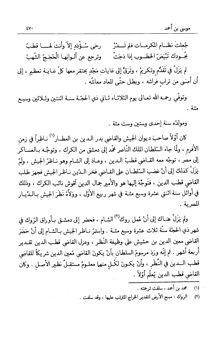 ولم يزل هناك الى أن عُمل روك الشام، فحضر الى دمشق بأوراق الروك في شهر ذي الحجة سنة ثلاث عشرة وسبع مئة. واستمر ناظر الجيش بالشام الى أن حضر القاضي معين الدين بن حشيش على وظيفة النّظر، وعزل القاضي قطب الدين تقدير أربعة أشهر. ثم إنه ورد مرسوم السلطان بأن يكون القاضي معين الدين شريكاً للقاضي قطب الدين في النّظر، وأن يكون لكل منهما معلوم مستقل نظير الأصل. وكان القاضي قطب الدين يعلّم أولاً.