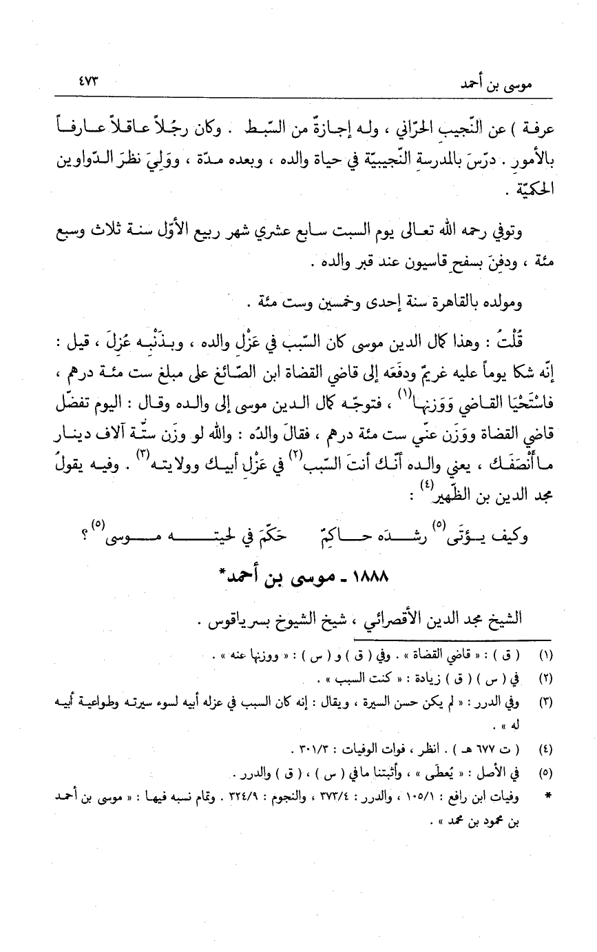 قلت: وهذا كمال الدين موسى كان السبب في عزل والده، وبذنبه عُزل، قيل: إنه شكا يوماً عليه غريم ودفعه الى قاضي القضاة ابن الصائغ على مبلغ ست مئة درهم، فاستحيا القاضي ووزنها، فتوجه كمال الدين موسى الى والده وقال: اليوم تفضّل قاضي القضاة ووزن عني ست مئة درهم، فقال والده: والله لو وزن ستة آلاف دينار ما أنصفك، يعني والده أنك أنت السبب في عزل أبيك وولايته. وفيه يقول مجد الدين بن الظّهير: