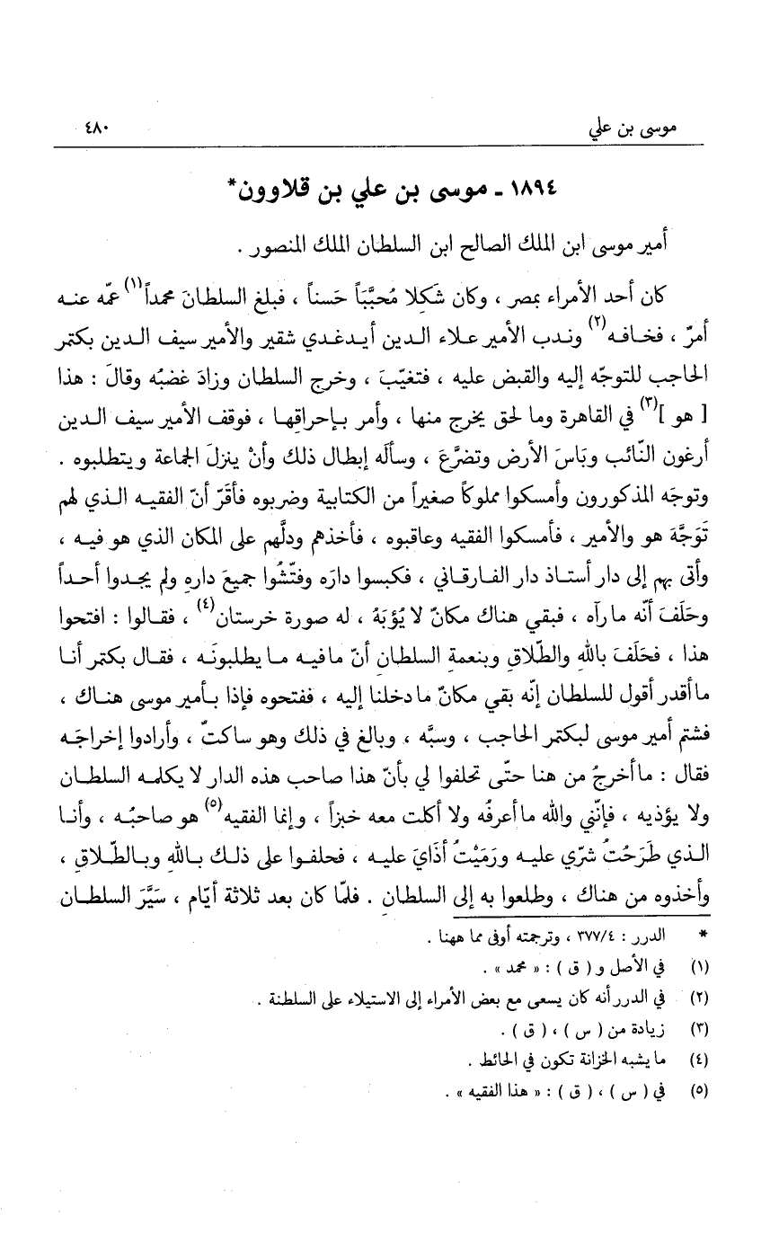 كان أحد الأمراء بمصر، وكان شكلاً محبباً حسناً، فبلغ السلطان محمداً عمه عنه أمر، فخافه وندب الأمير علاء الدين أيدغدي شقير والأمير سيف الدين بكتمر الحاجب للتوجه إليه والقبض عليه، فتغيّب، وخرج السلطان وزاد غضبه وقال: هذا هو في القاهرة وما لحق يخرج منها، وأمر بإحراقها، فوقف الأمير سيف الدين أرغون النائب وباس الأرض وتضرّع، وسأله إبطال ذلك وأن ينزل الجماعة ويتطلبوه، وتوجه المذكورون وأمسكوا مملوكاً صغيراً من الكتابية وضربوه فأقرّ أن الفقيه الذي لهم توجه هو والأمير، فأمسكوا الفقيه وعاقبوه، فأخذهم ودلّهم على المكان الذي هو فيه، وأتى بهم الى دار أستاذر دار الفارقاني، فكبسوا داره وفتّشوا جميع داره ولم يجدوا أحداً وحلف أنه ما رآه، فبقي هناك مكان لا يؤبه، له صورة خرستان، فقالوا: افتحوا هذا، فحلف بالله والطلاق وبنعمة السلطان أن ما فيه ما يطلبونه، فقال بكتمر أنا ما أقد أقول للسلطان إنه بقي مكان ما دخلنا إليه، ففتحوه فإذا بأمير موسى هناك، فشتم أمير موسى لبكتمر الحاجب، وسبّه، وبالغ في ذلك وهو ساكت، وأرادوا إخراجه فقال: ما أخرج من هنا حتى تحلفوا لي بأن هذا صاحب هذه الدار لا يكلمه السلطان ولا يؤذيه، فإنني والله ما أعرفه ولا أكلت معه خبزاً، وإنما الفقيه هو صاحبه، وأنا الذي طرحت شرّي عليه ورميت أذاي عليه، فحلفوا على ذلك بالله وبالطلاق، وأخذوه من هناك، وطلعوا به الى السلطان. فلما كان بعد ثلاثة أيام، سيّر السلطان