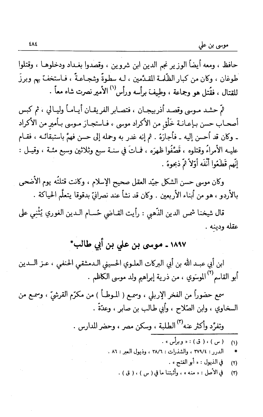 وكان موسى حسن الشكل جيد العقل صحيح الإسلام، وكانت قتلته يوم الأضحى بالأردو، هو من أبناء الأربعين. وكان قد نشأ عند نصراني بدقوقا يتعلّم الحياكة.