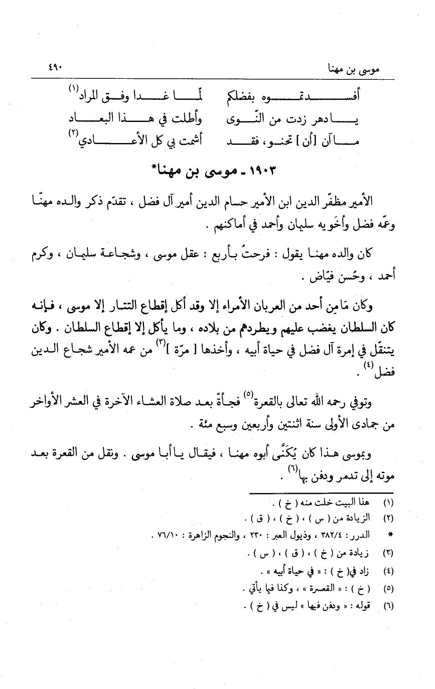 وبموسى هذا كان يُكنّى أبوه مهنا، فيقال يا أبا موسى. ونقل من القعرة بعد موته الى تدمر ودفن بها.
