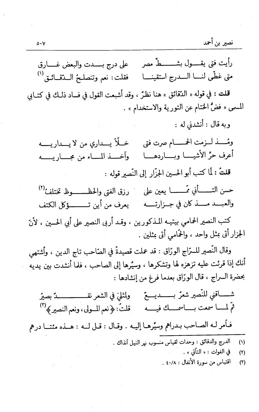 كتب النصير الحمامي بيتيه المذكورين، وقد أربى النصير على أبي الحسين، لأن الجزار أتى بمثل واحد، والحمّامي أتى بمثلين.