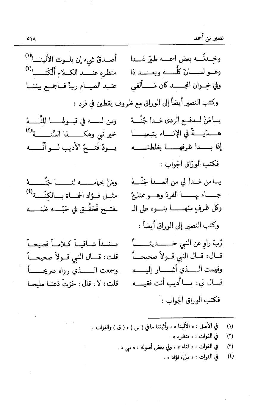 وكتب النصير أيضاً الى الوراق مع ظروف يقطين في فرد: