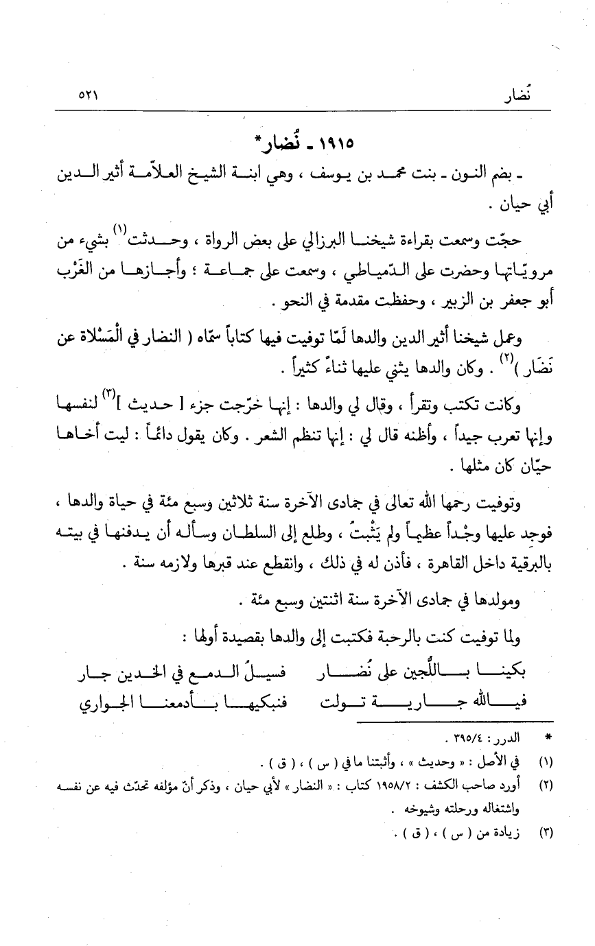 بضم النون - بنت محمد بن يوسف، وهي ابنة الشيخ العلامة أثير الدين أبي حيان.
