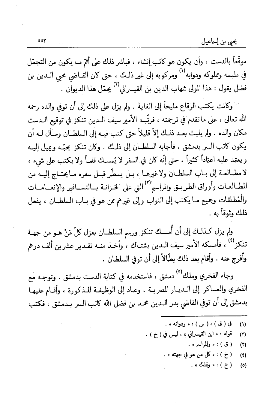موقّعاً بالدست، وأن يكون هو كاتب إنشاء، فباشر ذلك على أتمّ ما يكون من التجمّل في ملبسه ومملوكه ودوابه ومركوبه الى غير ذلك، حتى كان القاضي محيي الدين بن فضل يقول: هذا المولى شهاب الدين بن القيسراني يجمّل هذا الديوان.