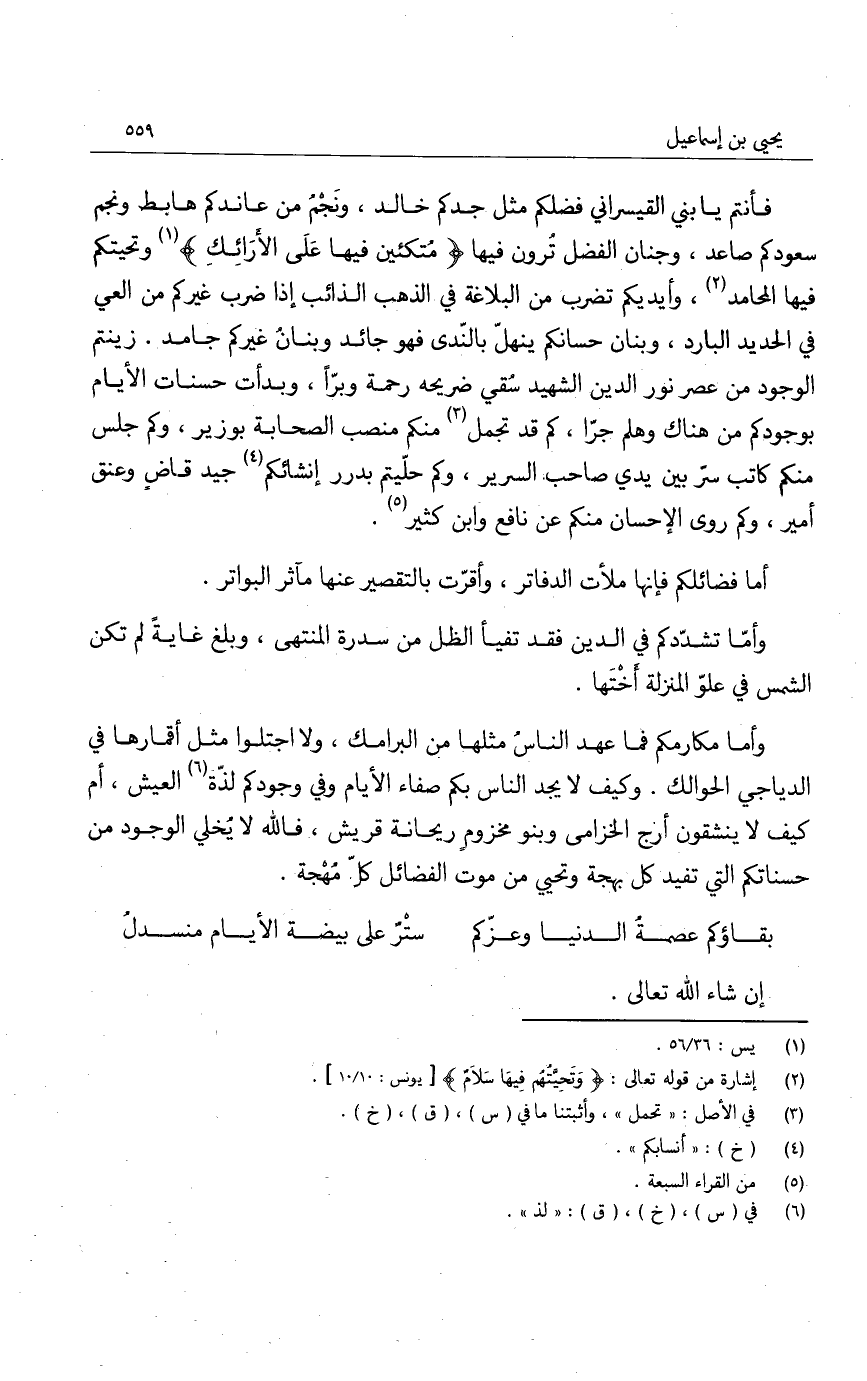 فأنتم يا بني القيسراني فضلكم مثل جدكم خالد، ونجمُ من عاندكم هابط ونجم سعودكم صاعد، وجنان الفضل ترون فيها " مُتكئين فيها على الأرائك " وتحيتكم فيها المحامد، وأيديكم تضرب من البلاغة في الذهب الذائب إذا ضرب غيركم من العي في الحديد البارد، وبنان حسانكم ينهلّ بالنّدى فهو جائد وبنانُ غيركم جامد. زينتم الوجود من عصر نور الدين الشهيد سُقي ضريحه رحمة وبرّاً، وبدأت حسنات الأيام بوجودكم من هناك وهلم جرّا، كم قد تجمل منكم منصب الصحابة بوزير، وكم جلس منكم كاتب سرّ بين يدي صاحب السرير، وكم حلّيتم بدرر إنشائكم جيد قاضٍ وعنق أمير، وكم روى الإحسان منكم عن نافع وابن كثير.