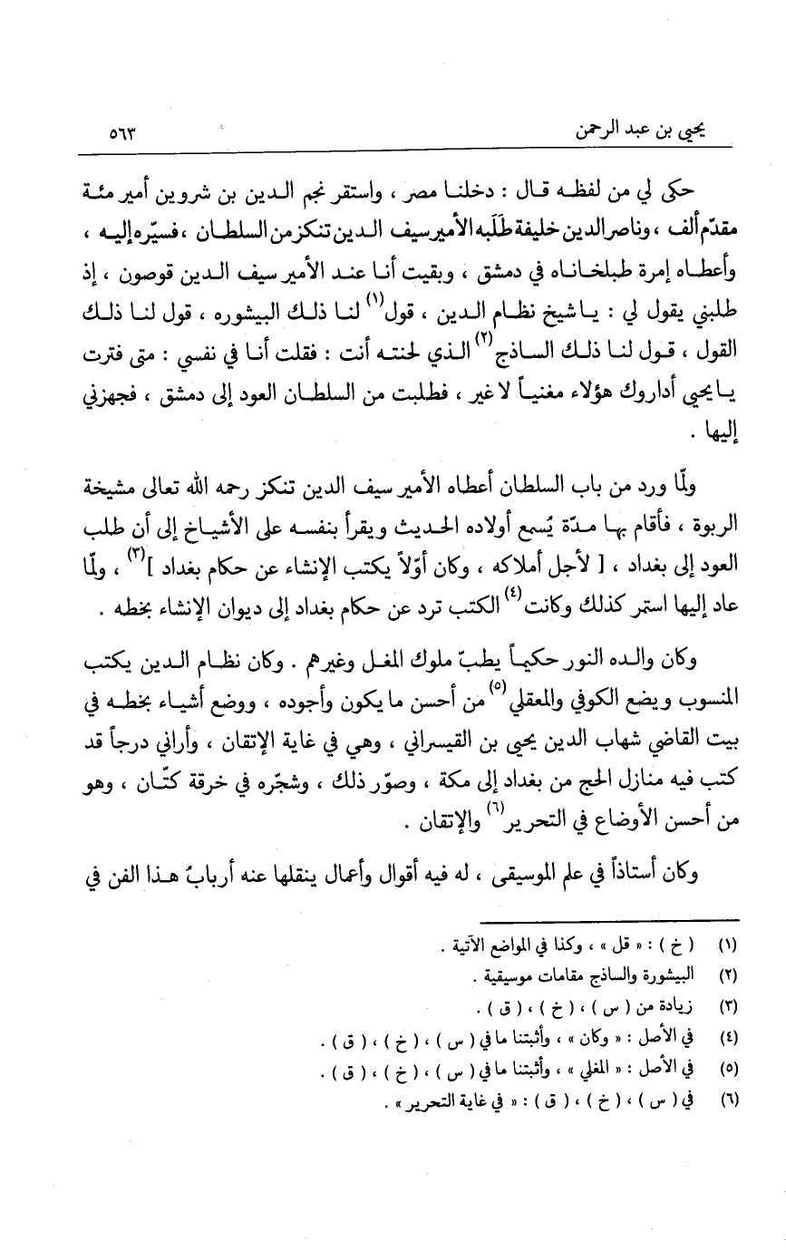 حكى لي من لفظه قال: دخلنا مصر، واستقر نجم الدين بن شروين أمير مئة مقدّم ألف، وناصر الدين خليفة طلبه الأمير سيف الدين تنكز من السلطان، فسيّره إليه، وأعطاه إمرة طبلخاناه في دمشق، وبقيت أنا عند الأمير سيف الدين قوصون، إذ طلبني يقول لي: يا شيخ نظام الدين، قول لنا ذلك البيشوره، قول لنا ذلك القول، قول لنا ذلك الساذج الذي لحنته أنت: فقلت أنا في نفسي: متى فترت يا يحيى أداروك هؤلاء مغنياً لا غير، فطلبت من السلطان العود الى دمشق، فجهزني إليها.