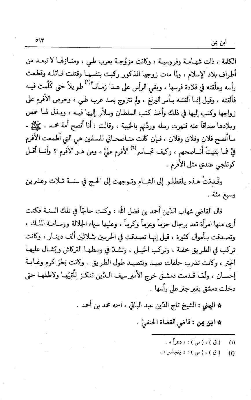 الكلمة، ذات شهامة وفروسية، وكانت مزوّجة بعرب طي، ومنازلها لا تبعد من أطراف بلاد الإسلام، ولما مات زوجها المذكور ركبت بنفسها وقتلت قاتله وقطعت رأسه وعلّقته في قلادة فرسها، وبقي الرأس على هذا زماناً طويلاً حتى كُلّمت فيه فألقته، وقيل إنما ألقته بأمر اليرلغ، ولم تتزوج بعد عرب طي، وحرص الأفرم على زواجها وكتب إليها في ذلك وأخذ كتب السلطان وسلار إليها فيه، وبذل لها حمص وبلادها صداقاً عنه فنهرت رسله وردّتهم بالخيبة، وقالت: أنا أنصح أمة محمد - صَلَّى اللهُ عَلَيْهِ وَسَلَّمَ - ما أنصح فلان وفلان وفلان، فإن كانت مناصحاتي للمسلمين هي التي أطمعت الإفرم فيّ فما بقيتُ أناصحهم، وكيف تجاسر الأفرم عليّ، ومن هو الأفرم؟ وأنا أقل كوتلجي عند مثل الأفرم.