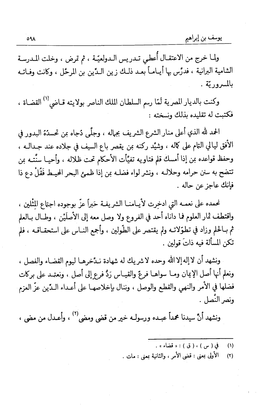 وكنت بالديار المصرية لما رسم السلطان الملك الناصر بولايته قاضي القضاة، فكتبت له تقليده بذلك ونسخته: الحمد لله الذي أعلى منار الشرع الشريف بجماله، وجلّى دُجاه بمن تحسدُه البدور في الأفق ليالي التمام على كماله، وشيّد ركنه بمن يقصر باع السيف في جلاده عند جداله، وحفظ قواعده بمن إذا أمسك قلم فتاويه تفيّأت الأحكام تحت ظلاله، وأحيا سنّته بمن تتضح به سنن حرامه وحلاله، ونشر لواء فضله بمن إذا ظمئ البحر المحيط فقُلْ دع ذا فإنك عاجز عن حاله.