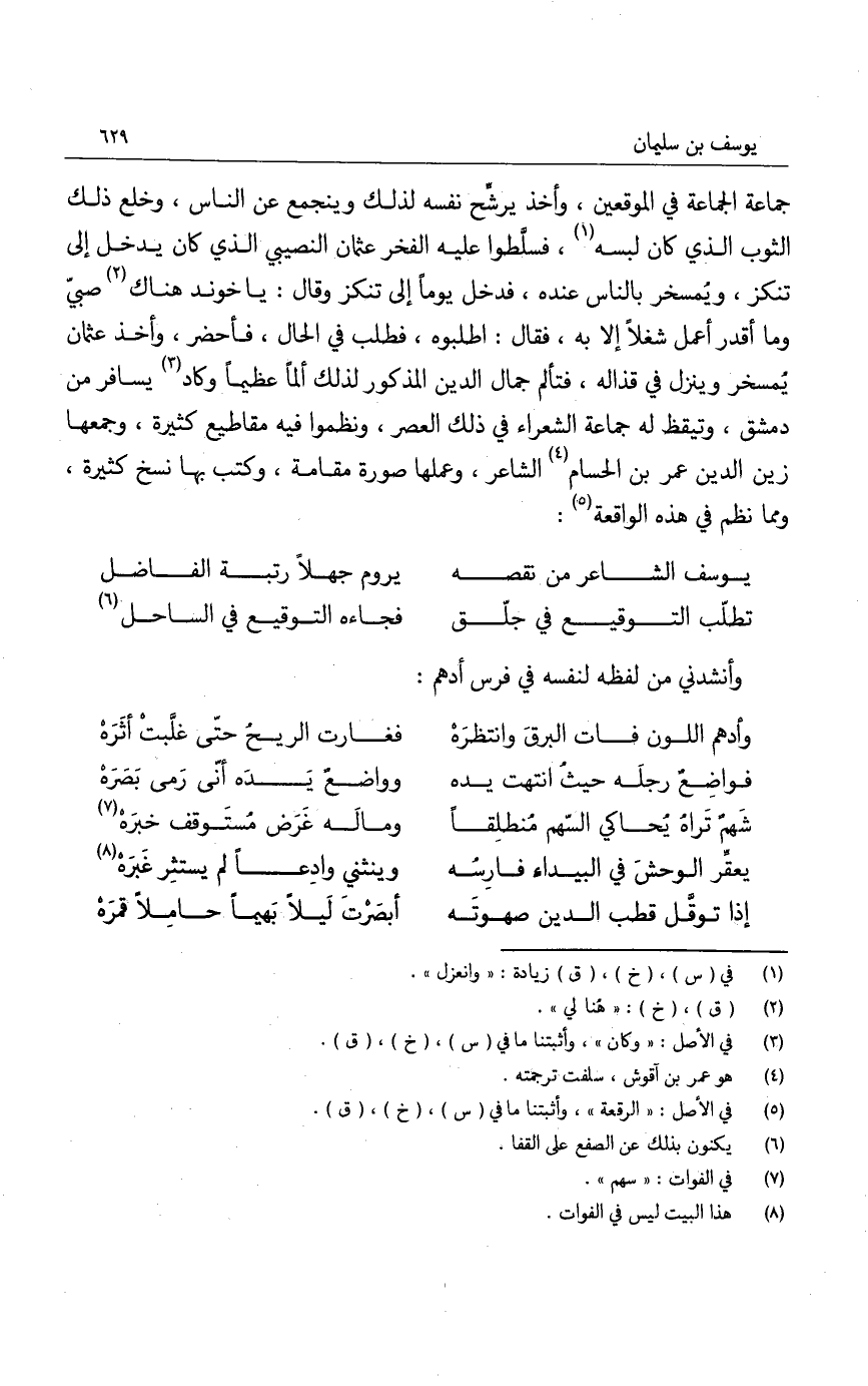 جماعة الجماعة في الموقعين، وأخذ يرشّح نفسه لذلك وينجمع عن الناس، وخلع ذلك الثوب الذي كان لبسه، فسلّطوا عليه الفخر عثمان النصيبي الذي كان يدخل الى تنكز، ويُمسخر بالناس عنده، فدخل يوماً الى تنكز وقال: يا خوند هناك صبي وما أقدر أعمل شغلاً إلا به، فقال: اطلبوه، فطلب في الحال، فأحضر، وأخذ عثمان يمسخر وينزل في قذاله، فتألم جمال الدين المذكور لذلك ألماً عظيماً وكاد يسافر من دمشق، وتيقظ له جماعة الشعراء في ذلك العصر، ونظموا فيه مقاطيع كثيرة، وجمعها زين الدين عمر بن الحسام الشاعر، وعملها صورة مقامة، وكتب بها نسخ كثيرة، ومما نظم في هذه الواقعة: