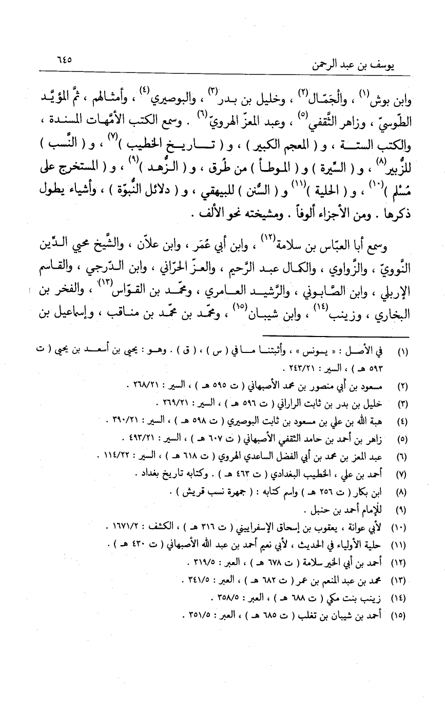 وابن بوش، والجمّال، وخليل بن بدر، والبوصيري، وأمثالهم، ثم المؤيّد الطوسي، وزاهر الثقفي، وعبد المعزّ الهروي. وسمع الكتب الأمهات المسندة، والكتب الستة، والمعجم الكبير، وتاريخ الخطيب، والنّسب للزبير، والسيرة والموطأ من طرق، والزهد، والمستخرج على مُسلم، والحلية والسُنن للبيهقي، ودلائل النبوة، وأشياء يطول ذكرها. ومن الأجزاء ألوفاً. ومشيخته نحو الألف.