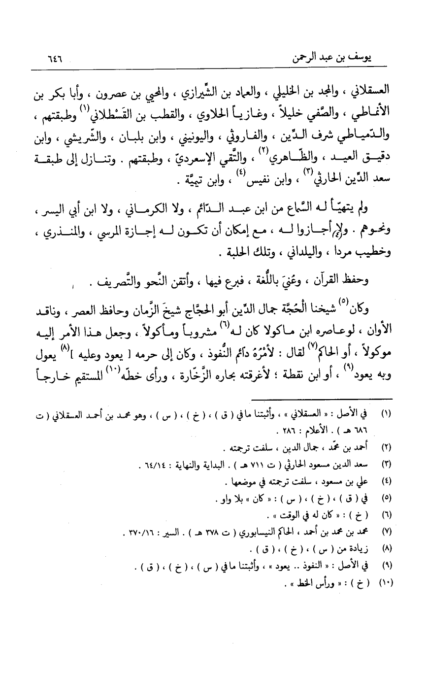 وكان شيخنا الحجة جمال الدين أبو الحجاج شيخ الزمان وحافظ العصر، وناقد الأوان، لو عاصره ابن ماكولا كان له مشروباً ومأكولا، وجعل هذا الأمر إليه موكولا، أو الحاكم لقال: لأمرُهُ دائم النفوذ، وكان الى حرمه يعود وعليه يعول وبه يعود، أو ابن نقطة، لأغرقته بحاره الزّخّارة، ورأى خطه المستقيم خارجاً