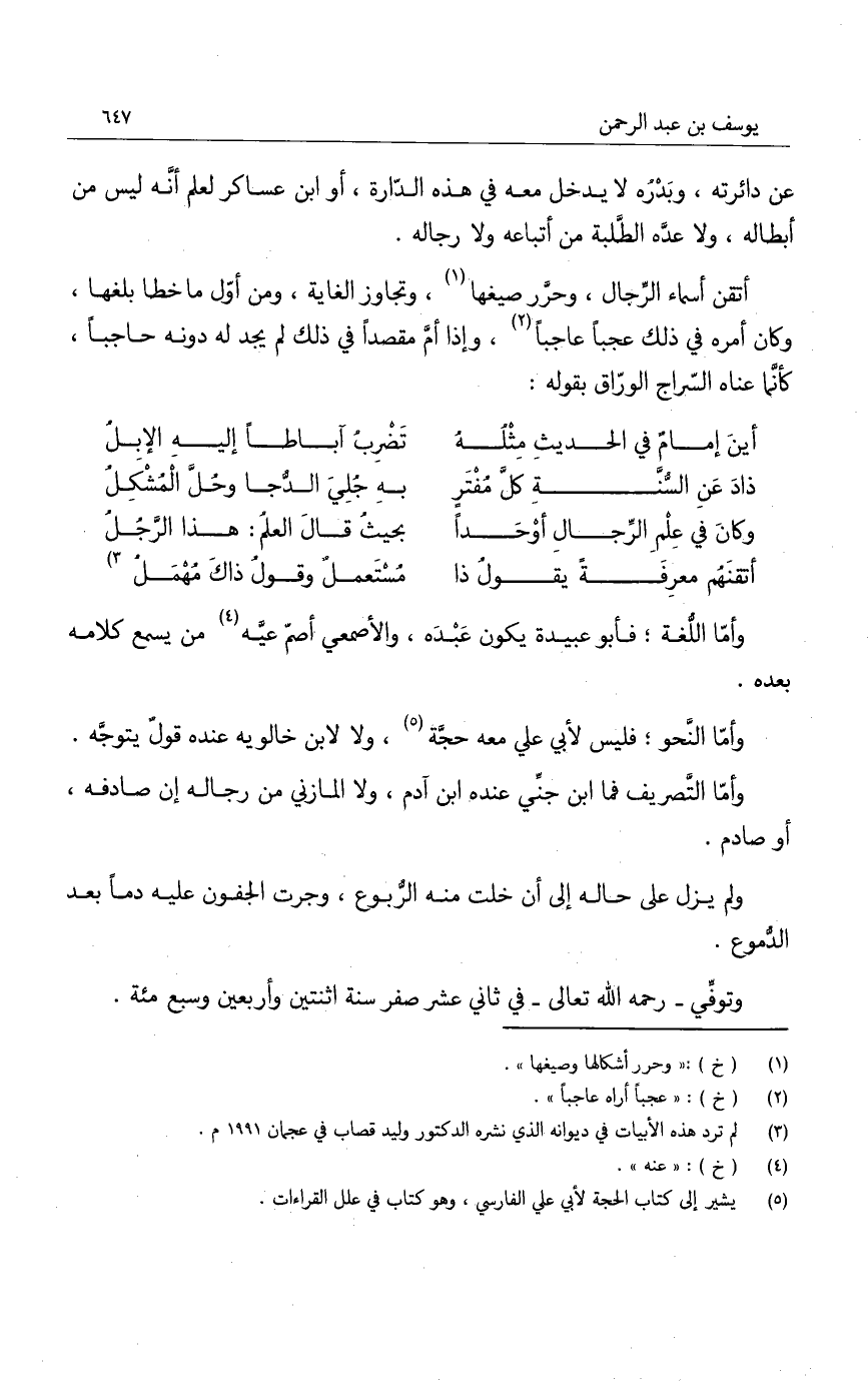 وأما اللغة، فأبو عبيدة يكون عبده، والأصمعي أصمّ عيّه من يسمع كلامه بعده.