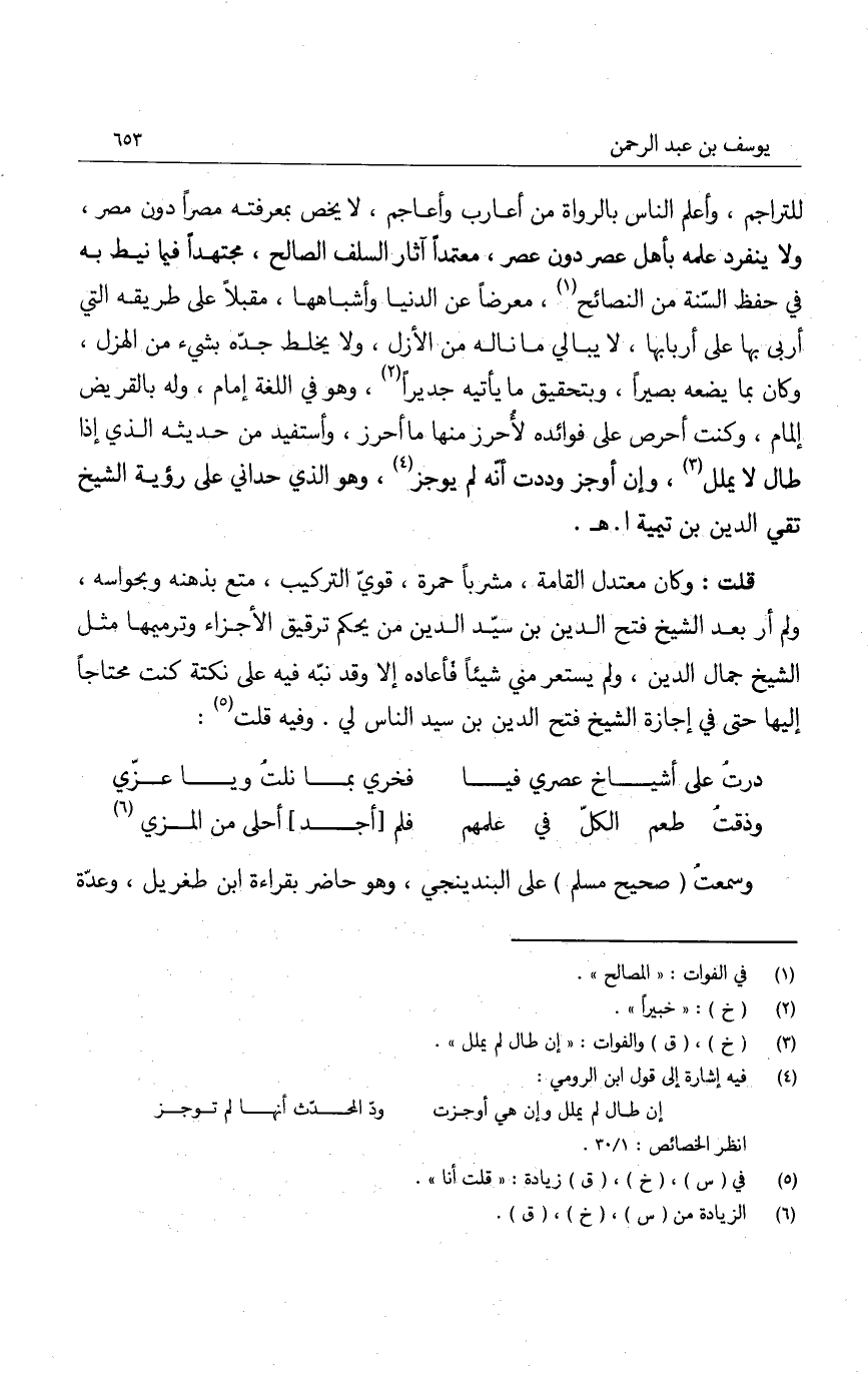 للتراجم، وأعلم الناس بالرواة من أعارب وأعاجم، لا يخص بمعرفته مصراً دون مصر، ولا ينفرد علمه بأهل عصر دون عصر، معتمداً آثار السلف الصالح، مجتهداً فيما نيط به في حفظ السّنة من النصائح، معرضاً عن الدنيا وأشباهها، مقبلاً على طريقه التي أربى بها على أربابها، لا يبالي ما ناله من الأزل، ولا يخلط جدّه بشيء من الهزل، وكان بما يضعه بصيراً، وبتحقيق ما يأتيه جديراً، وهو في اللغة إمام، وله بالقريض إلمام، وكنت أحرص على فوائده لأحرز منها ما أحرز، وأستفيد من حديثه الذي إذا طال لا يملل، وإن أوجز وددت أنه لم يوجز، وهو الذي حداني على رؤية الشيخ تقي الدين بن تيمية.